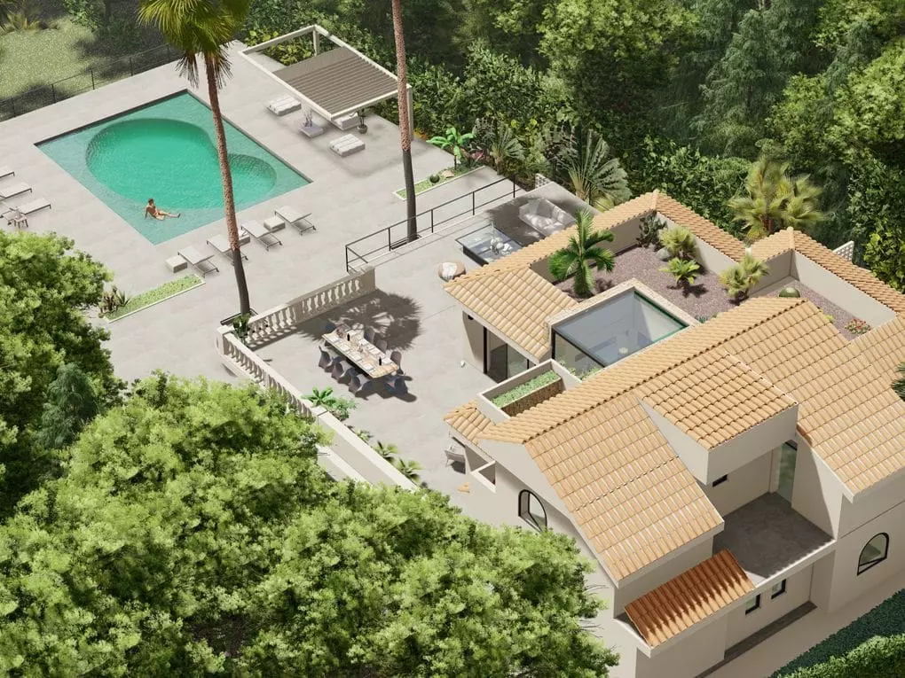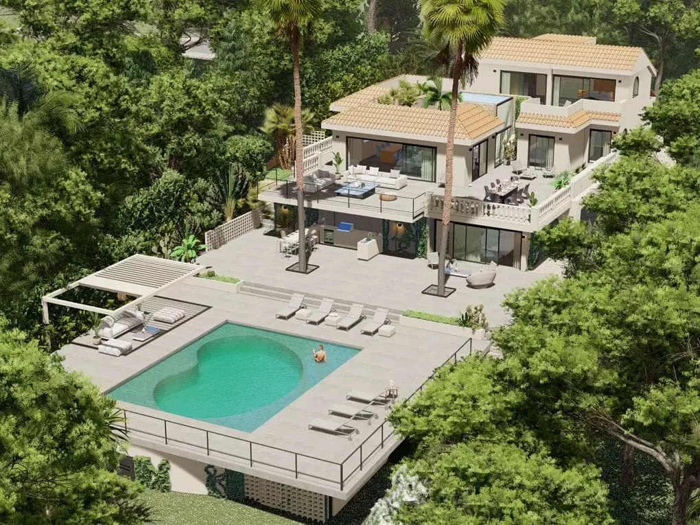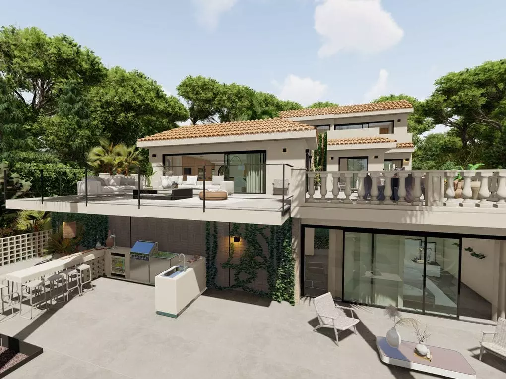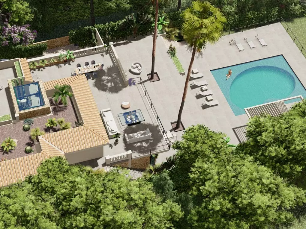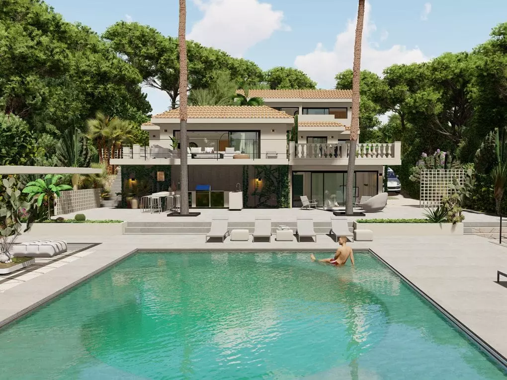 This villa features a Mediterranean garden and pool situated in the southwest of Mallorca, specifically in the sought-after area of Costa d’en Blanes in Calviá.