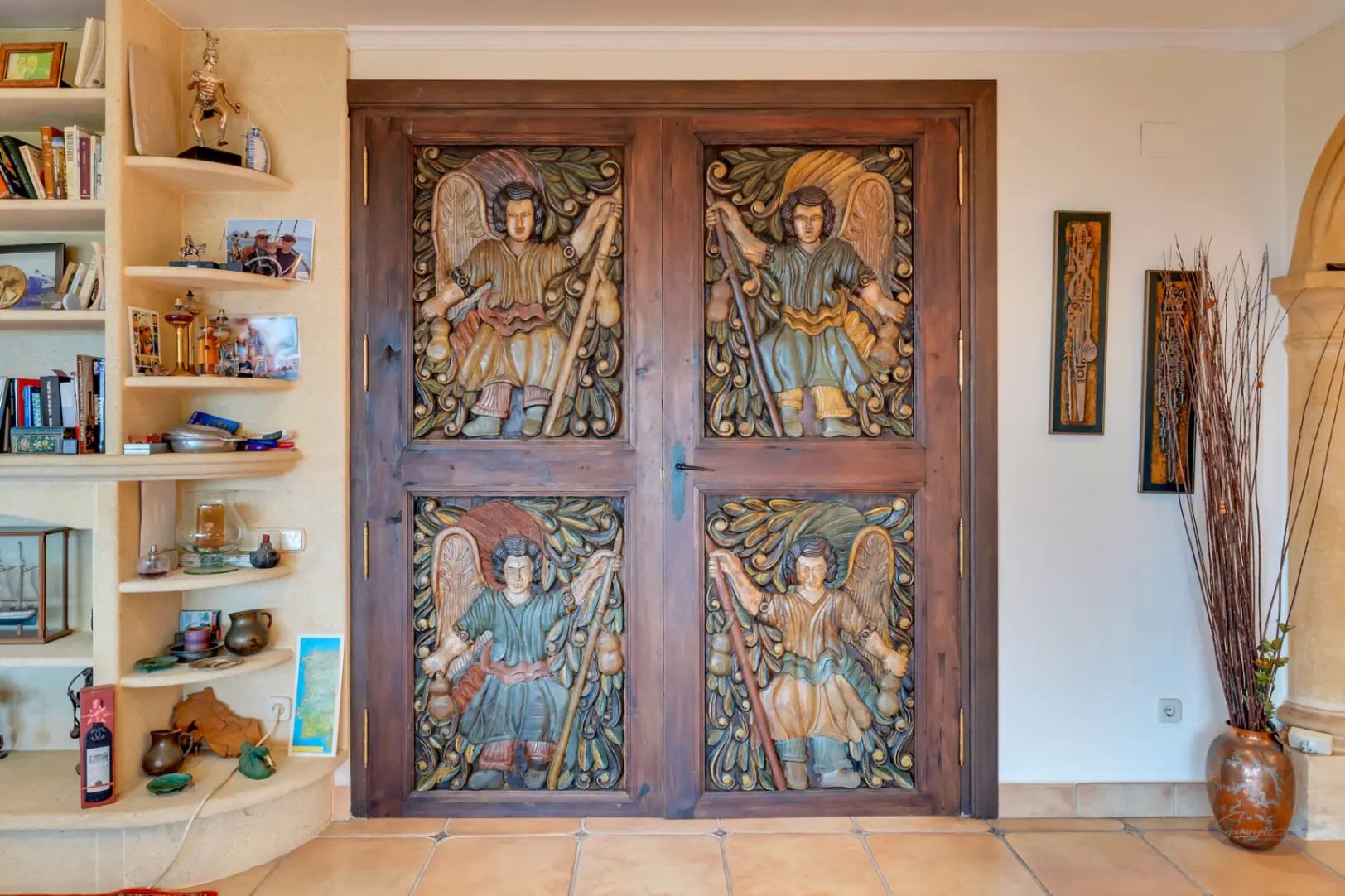 Built in 2005 and meticulously crafted with high-quality materials, this villa highlights attention to detail without compromising on privacy and spaciousness. The moment you step into the property, the well-maintained garden greets you, leading to an inviting covered porch that opens into a grand entrance hall. This space features an artistic wrought-iron staircase and beautifully hand-carved doors from a renowned Mexican artist, making it a warm and welcoming area for you and your guests.