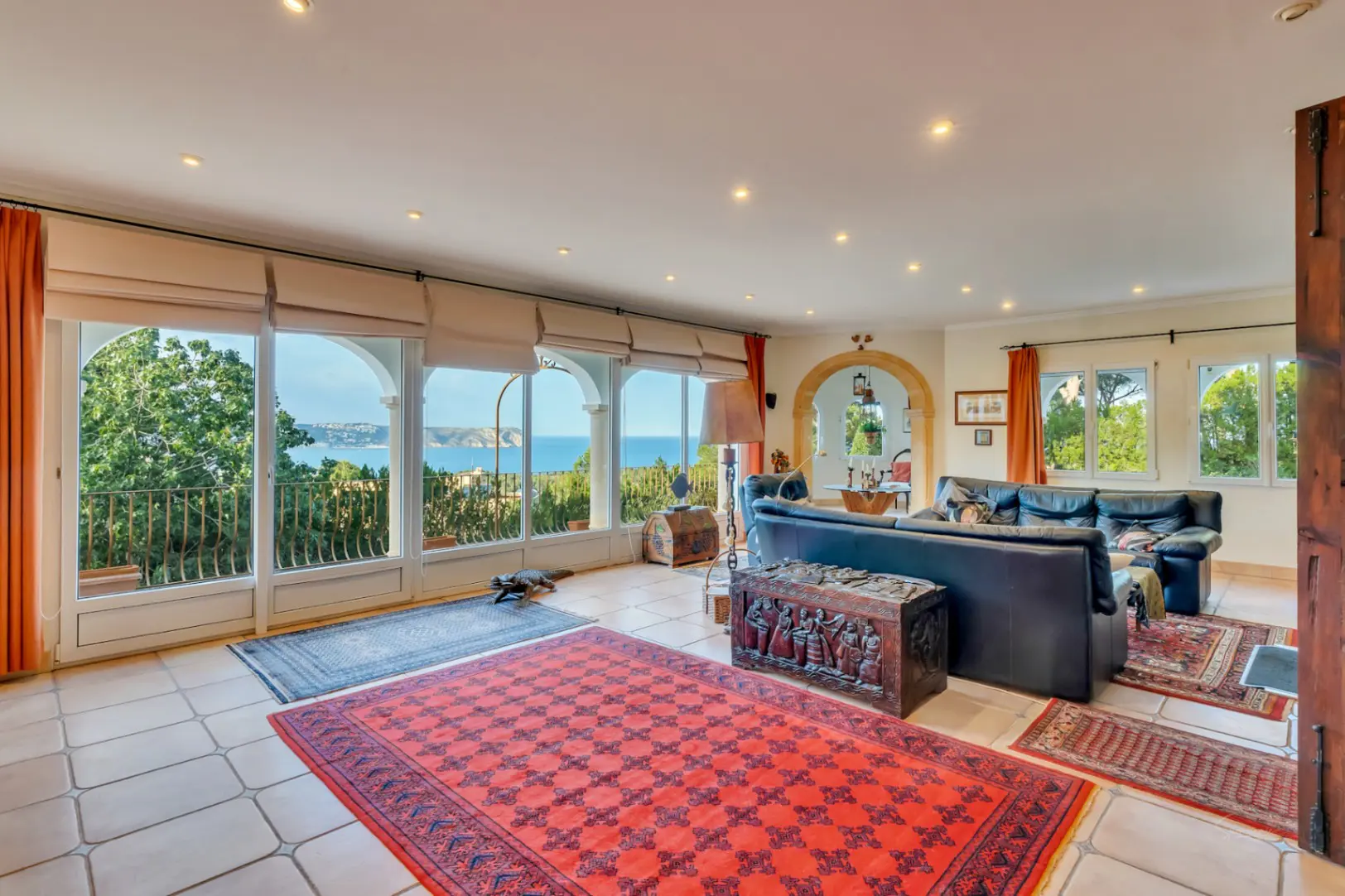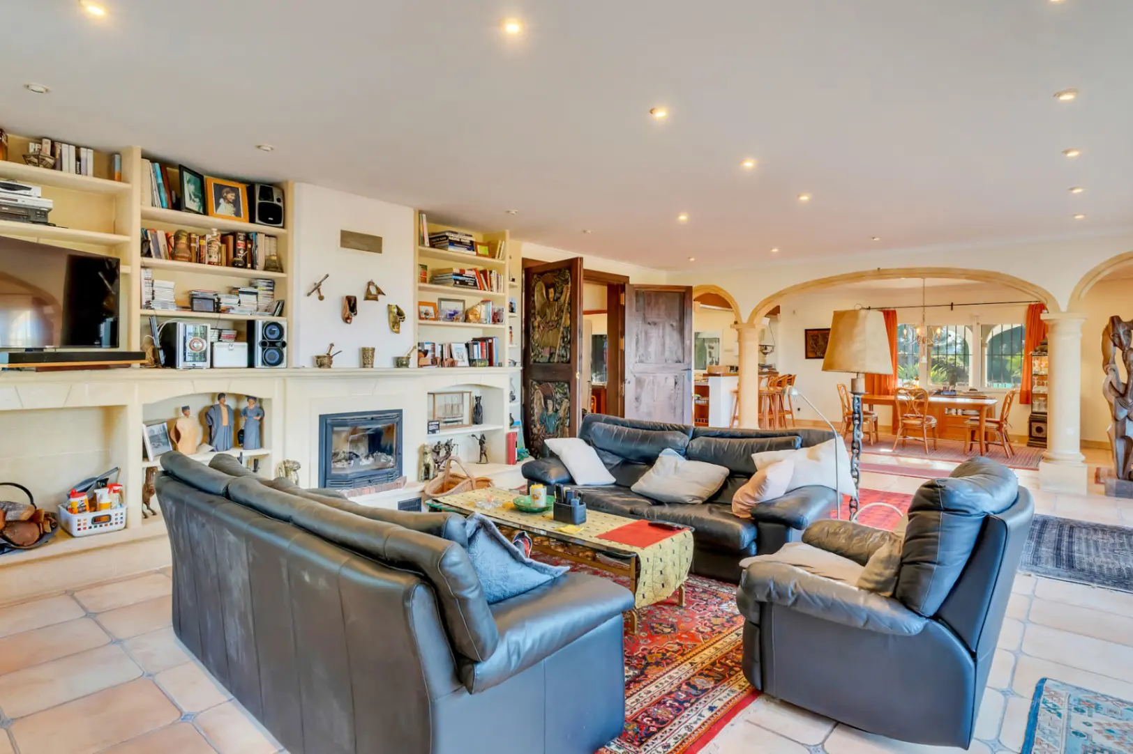 The main living room, drenched in natural light, creates an ambience that’s perfect for both relaxation and entertaining. With direct access to a terrace offering exceptional views of the Mediterranean, it’s an idyllic setting for those quiet evenings at home or lively gatherings with friends. Imagine cozying up next to the fireplace or enjoying a good book in the circular reading room. The seamless transition to the elegant dining room and a fully equipped American kitchen makes entertaining an absolute breeze.