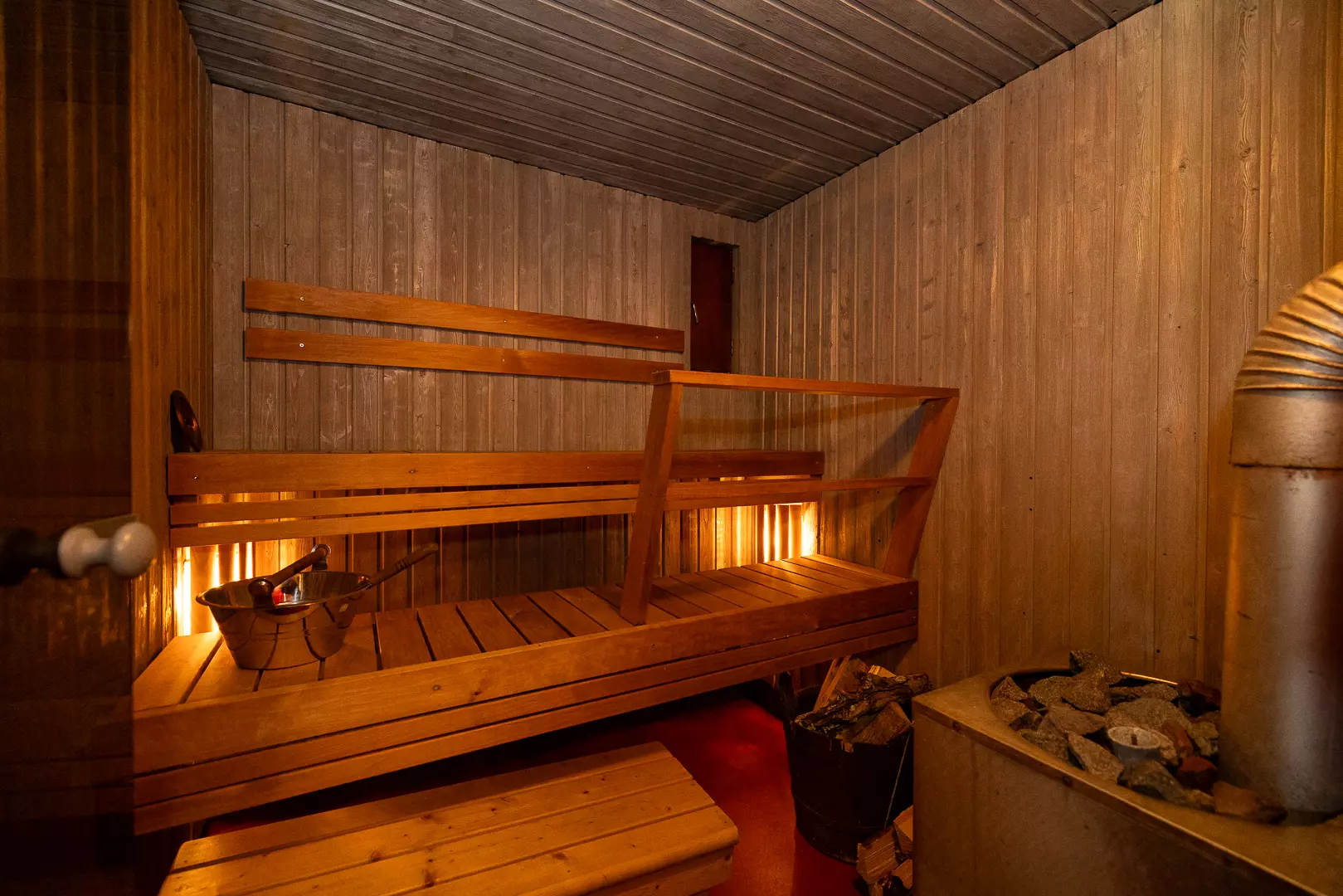 The ground floor includes a living room with access to the yard, a kitchen with a separate laundry room, a bedroom/guest room, and a toilet. The upper floor has two to three bedrooms, a small hallway, and a toilet. In the wing, there is a bathroom, sauna, cold storage room, storage areas, and a garage.