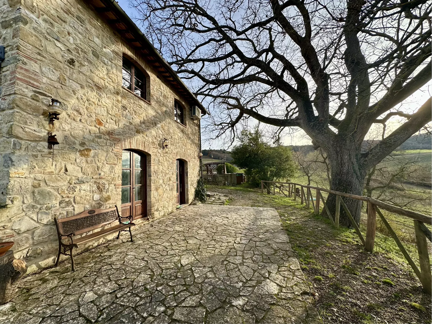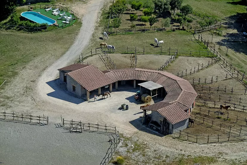 It is a small village surrounded by 20 hectares of land, of which 13 are arable and 4 are woodland and parkland with centuries-old oak trees, currently used as a farmhouse, and consisting of 3 stone buildings with 6 completely renovated apartments of approximately 60-70 square metres, featuring terracotta floors and exposed wooden beam ceilings, each with its own independent entrance and outdoor space.