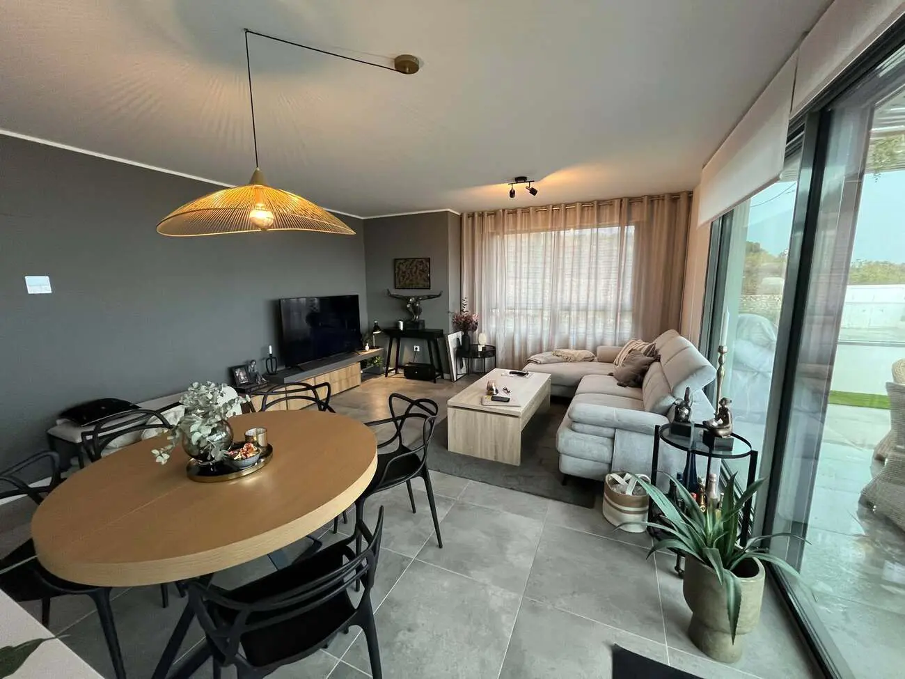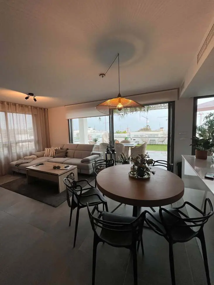 Upon entering, you are greeted by a hallway with tiled flooring. The property includes three bedrooms, each equipped with wardrobes. The master bedroom has its own bathroom. The living room and kitchen are designed in an open-plan layout, providing ample cupboard space and equipped with modern appliances.
