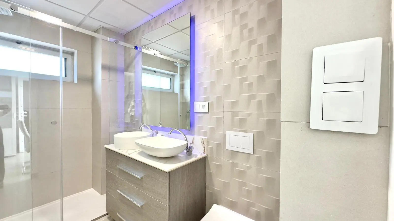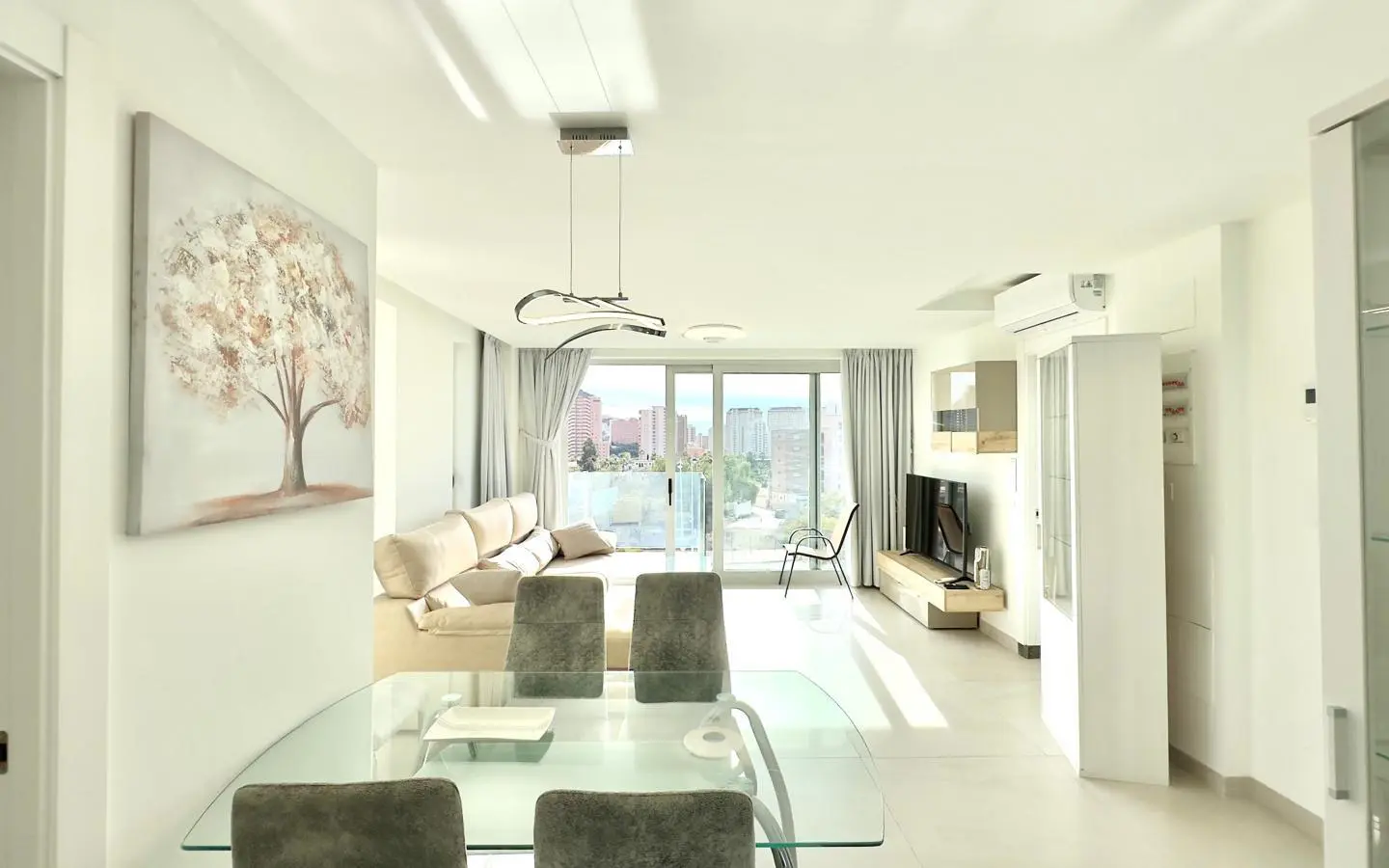 In one of the most dynamic areas of Benidorm, a residential complex stands out as a private oasis for those looking to enjoy the Mediterranean with an added sense of exclusivity and tranquility. As you enter this complex, it feels almost like stepping into a small resort, where every feature is designed to help you unwind. A long, deep blue swimming pool runs alongside the building, serving as the focal point of daily life, surrounded by comfortable sun loungers, hanging chairs, and lush green spaces that encourage relaxation away from the city’s hustle and bustle.
