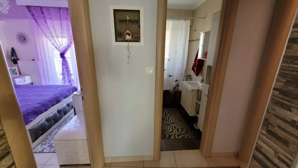 For sale apartment of 84 sq.meters in the suburbs of Thessaloniki. The apartment is situated on the 2nd floor. It consists of 2 bedrooms, living room with kitchen, one bathroom, one storeroom. Flat has double-frontage layout. There are: a fireplace, air conditioning, awnings, heating. Building has an elevator. Extras included with the property: parking space.
