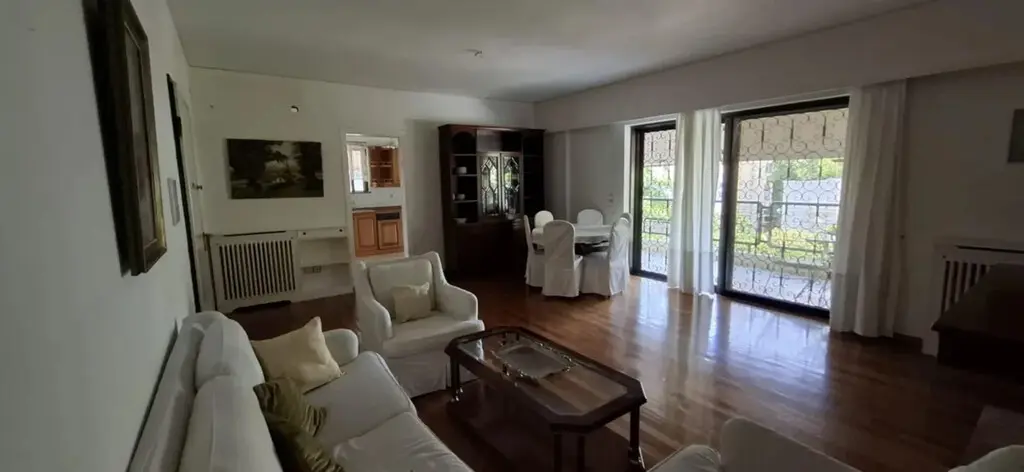 For sale apartment of 96 sq.meters in Athens. The apartment is situated on the 2nd floor. It consists of 2 bedrooms, living room, one kitchen, one dining room, one bathroom, one WC. Flat has double-frontage layout. There are: a fireplace, awnings, heating. Building has an elevator.