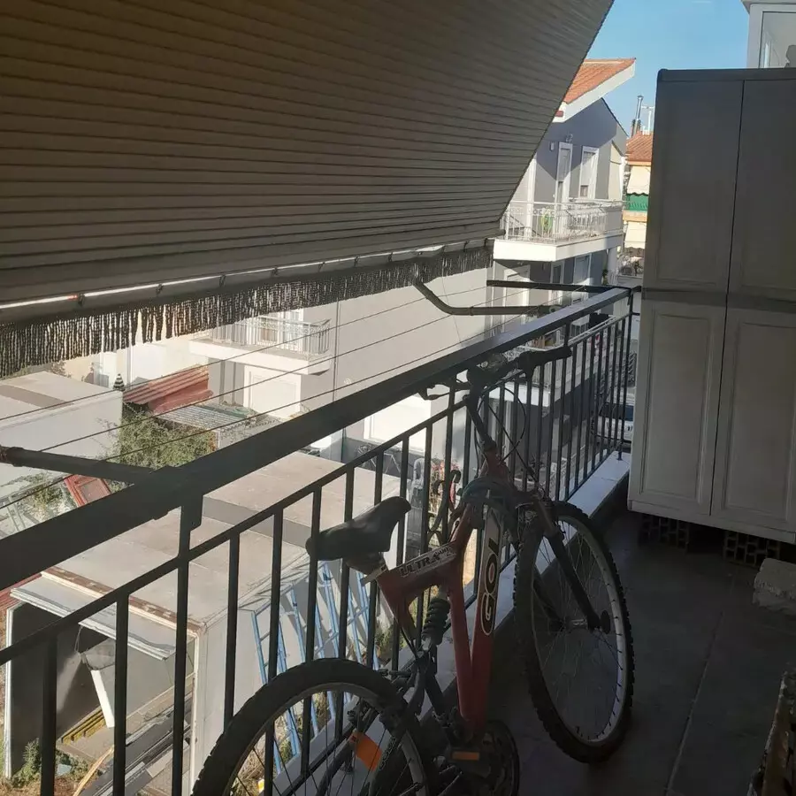 The apartment has a front layout, providing views of the surrounding cityscape from its windows. It comes equipped with essential amenities, including air conditioning for temperature control and heating options for cooler days. Awnings are also present to provide some shade and privacy.