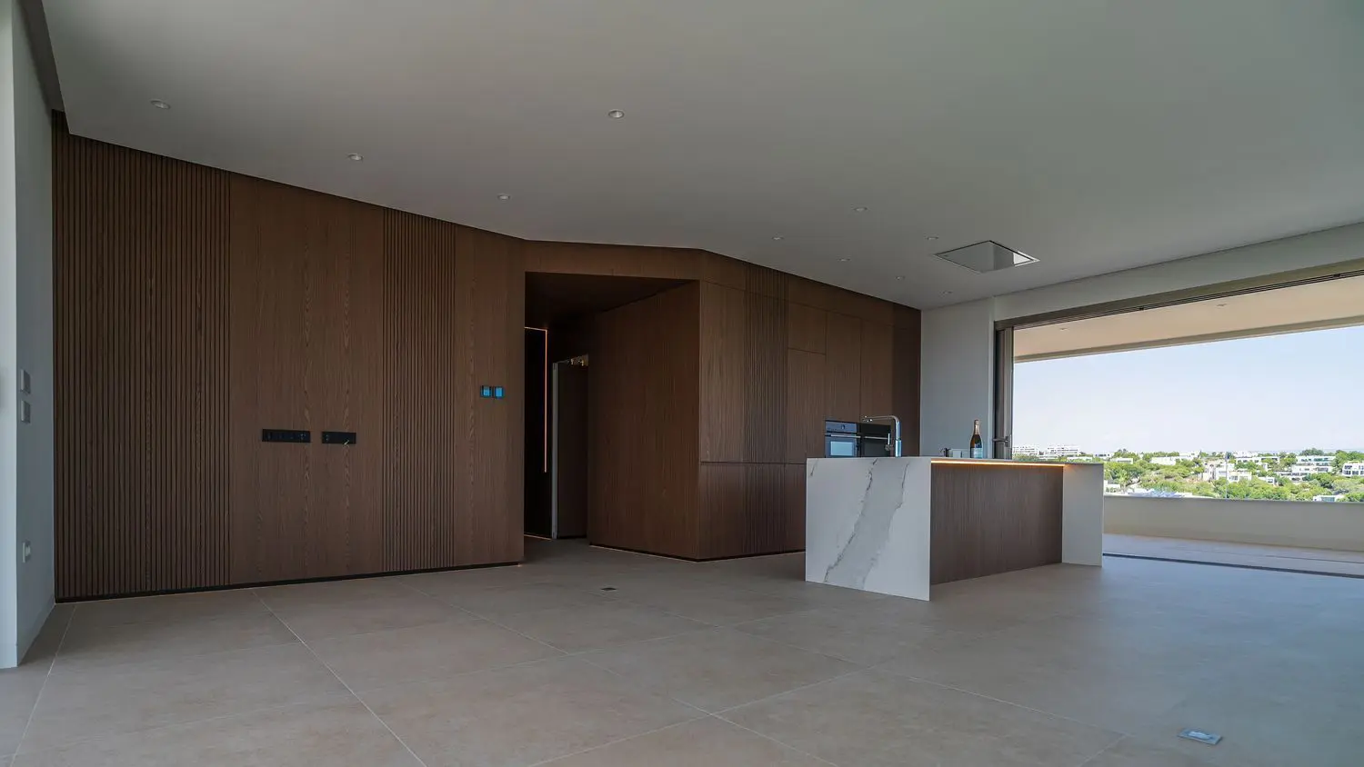 The interiors combine contemporary elegance with natural warmth. Earthy tones, wood-panelled feature walls, designer lighting, and high-end materials create a sophisticated yet welcoming feel throughout. Lighting details have been meticulously considered, with soft illumination from integrated fixtures, including along the skirting boards, enhancing the apartment’s unique and high-quality finish.