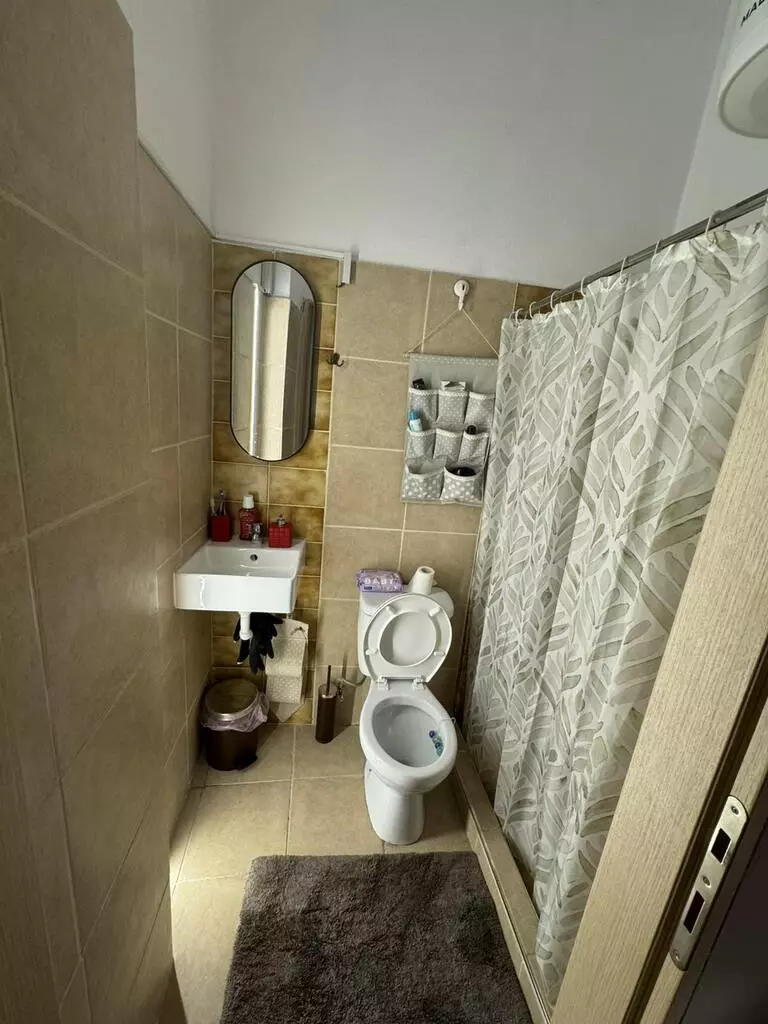 The layout of the apartment includes one bedroom, a living room that connects to the kitchen area, and a shower WC. This setup offers a practical space for those looking to reside in Athens. The front layout maximizes natural light, creating an inviting environment.
