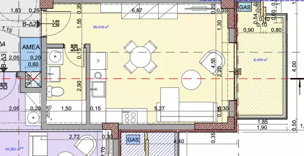 This apartment features an interior layout that includes a living room with an integrated kitchen area. The design is functional and allows for efficient use of space. Additionally, there is one shower WC, providing essential amenities for daily living.