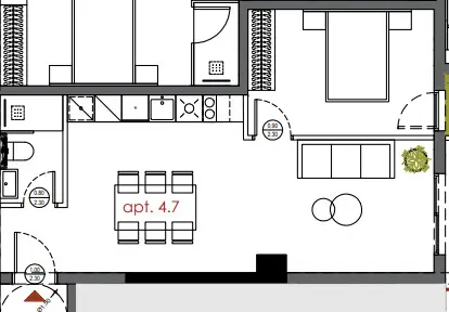 The apartment comprises one bedroom and a living room that is combined with a kitchen. Additionally, it includes one shower WC. The layout is designed to enhance functionality and offer convenience, making it suitable for various lifestyles, whether for individuals or small families.