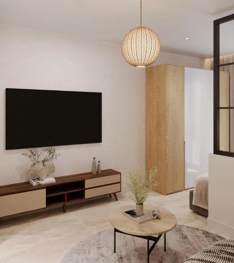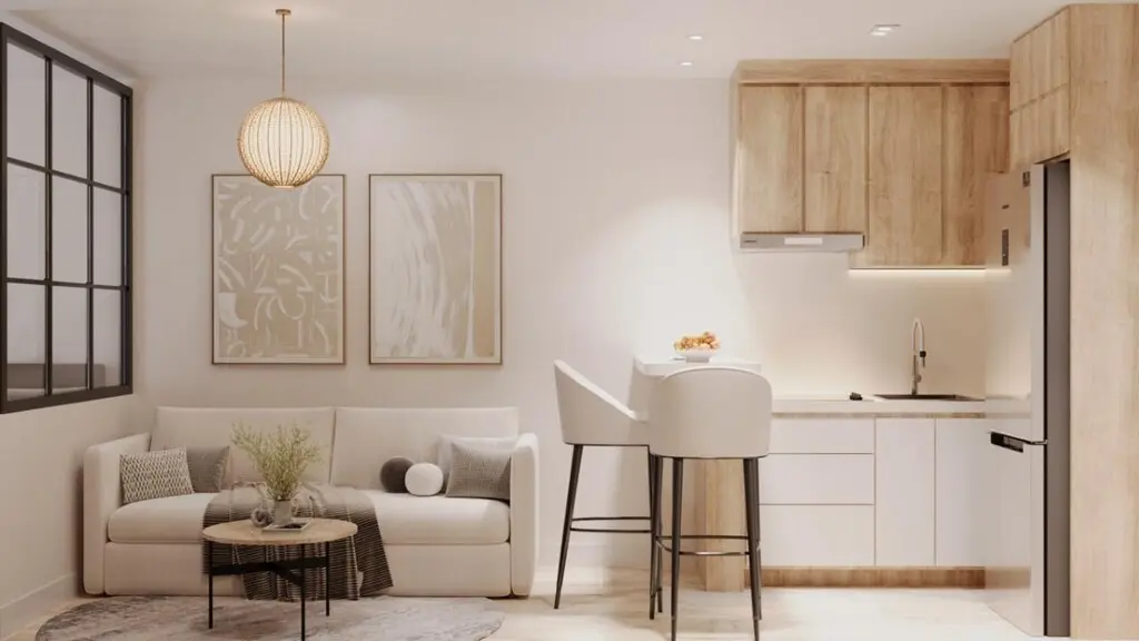 The apartment includes a living room combined with a kitchen area, making efficient use of space. There is one shower WC included, providing essential facilities for daily needs. Additionally, the flat is equipped with air conditioning, offering temperature control for warmer months.