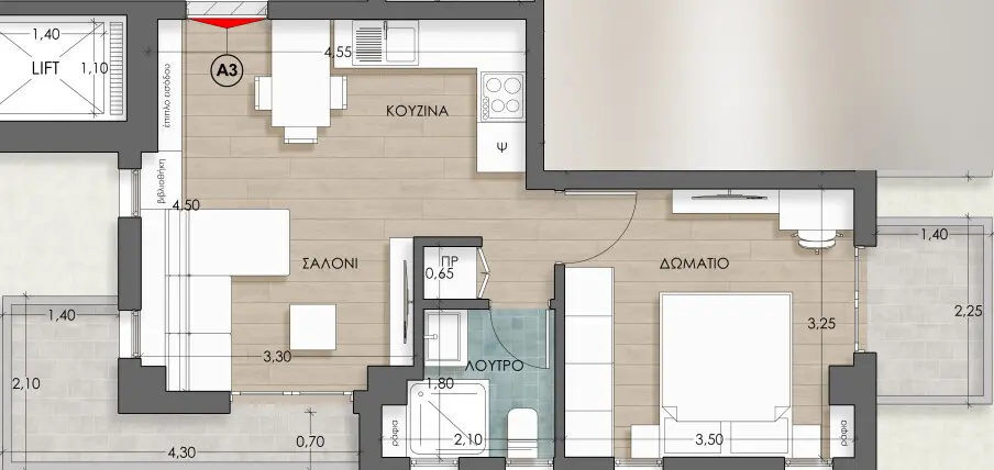 This apartment is situated on the first floor and features a front layout. It consists of one bedroom, a living room with an integrated kitchen, and a shower WC. This arrangement provides a practical living space suitable for individuals or couples.