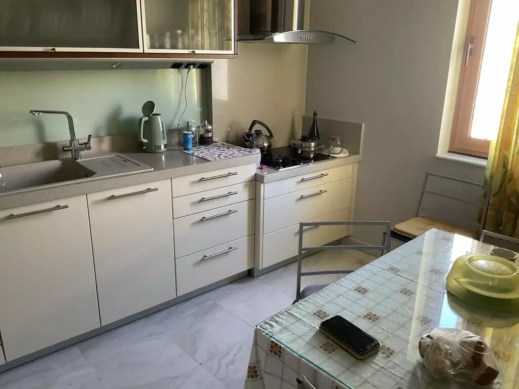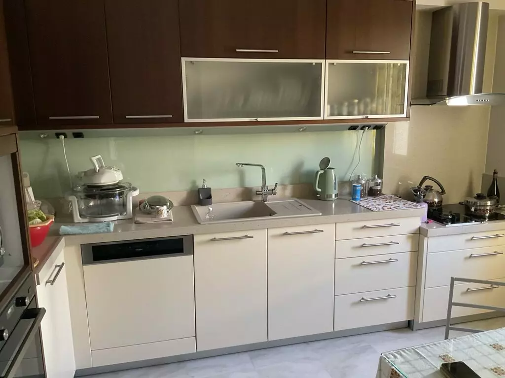 The apartment comprises three bedrooms, a living room that features an integrated kitchen, one kitchen, a bathroom, a shower WC, and a storeroom. The front layout of the apartment allows for views of the city and the sea, providing a pleasant backdrop from the windows.