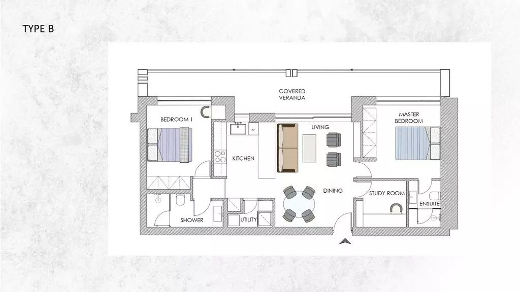 The apartment features two bedrooms, making it suitable for small families or individuals seeking additional space. The living area merges with the kitchen, creating a functional environment for daily activities. For convenience, there are two shower WCs, which can accommodate multiple residents efficiently. Additionally, a storeroom is included, providing extra space for storage needs.