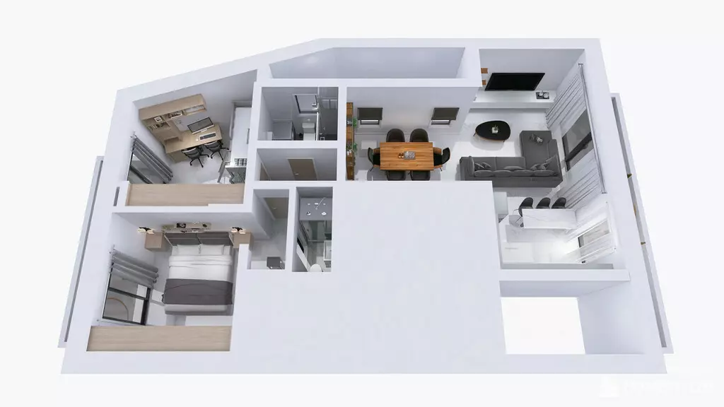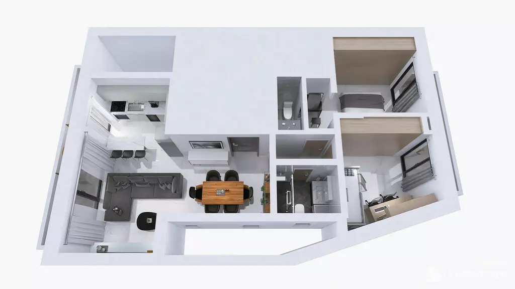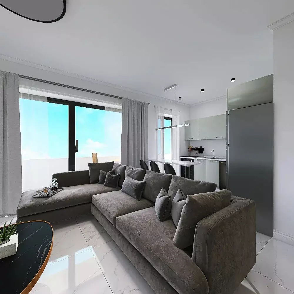The apartment features two bedrooms, making it suitable for a variety of living arrangements. The layout includes a living room that integrates with a kitchen, providing a welcoming area for residents. Additionally, there are two bathrooms, contributing to the functionality of the space.