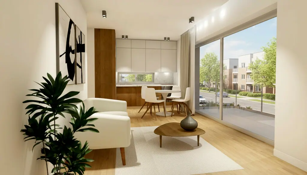 The layout includes 2 bedrooms, a living room that connects with the kitchen, and a shower WC. The front layout allows for natural light to filter in, enhancing the daily living experience. The construction is designed for modern convenience with a focus on practicality.