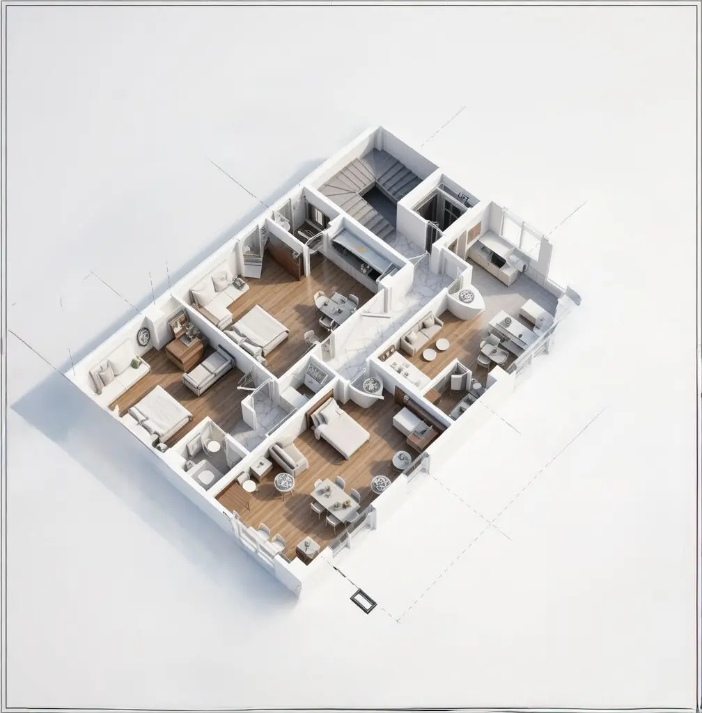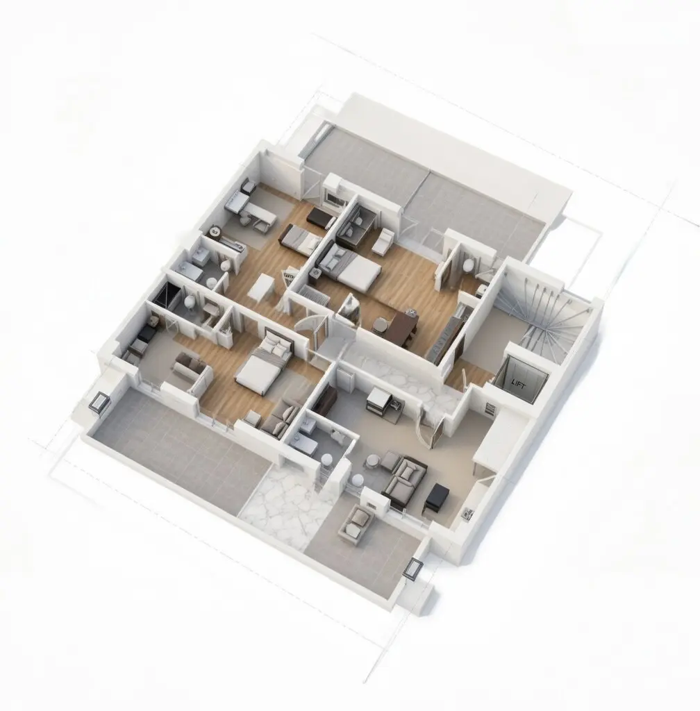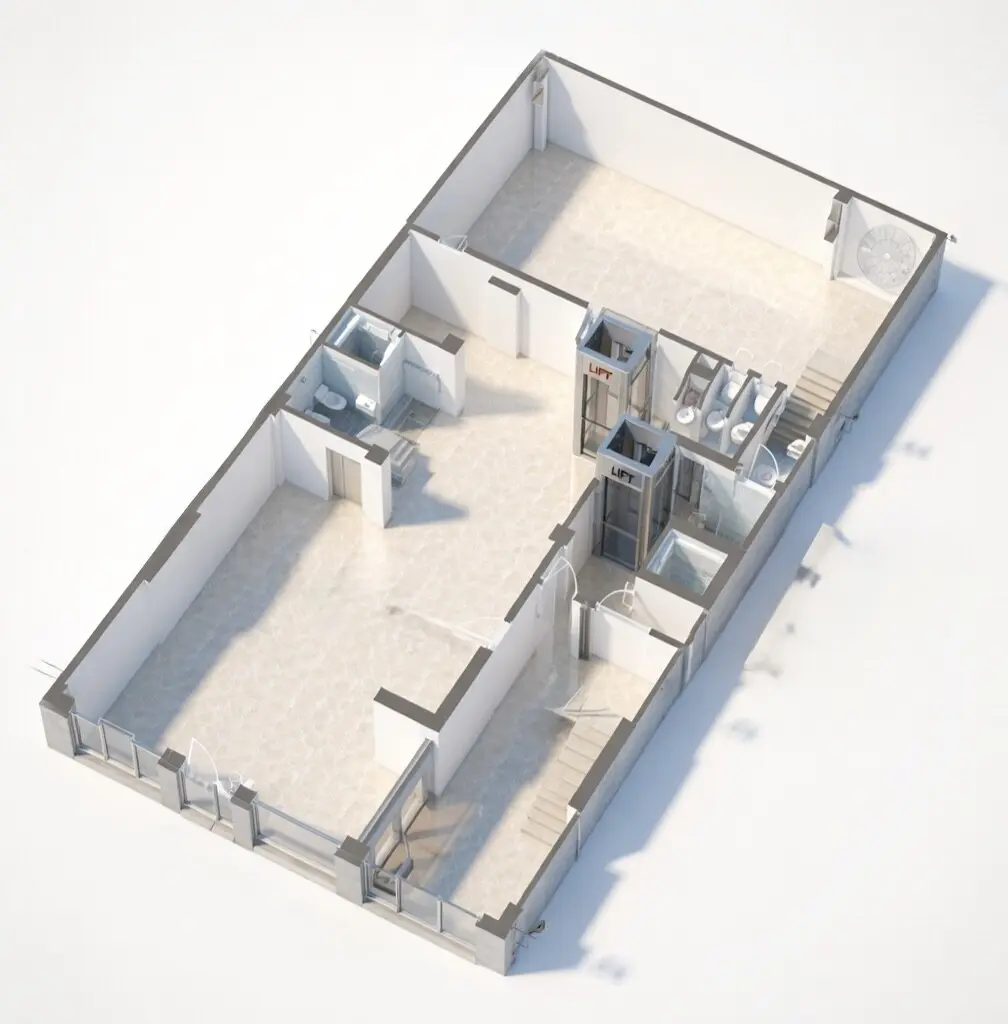 The building is equipped with solar panels for water heating. It also features awnings and a heating system. An elevator is present within the building, facilitating access to different areas.