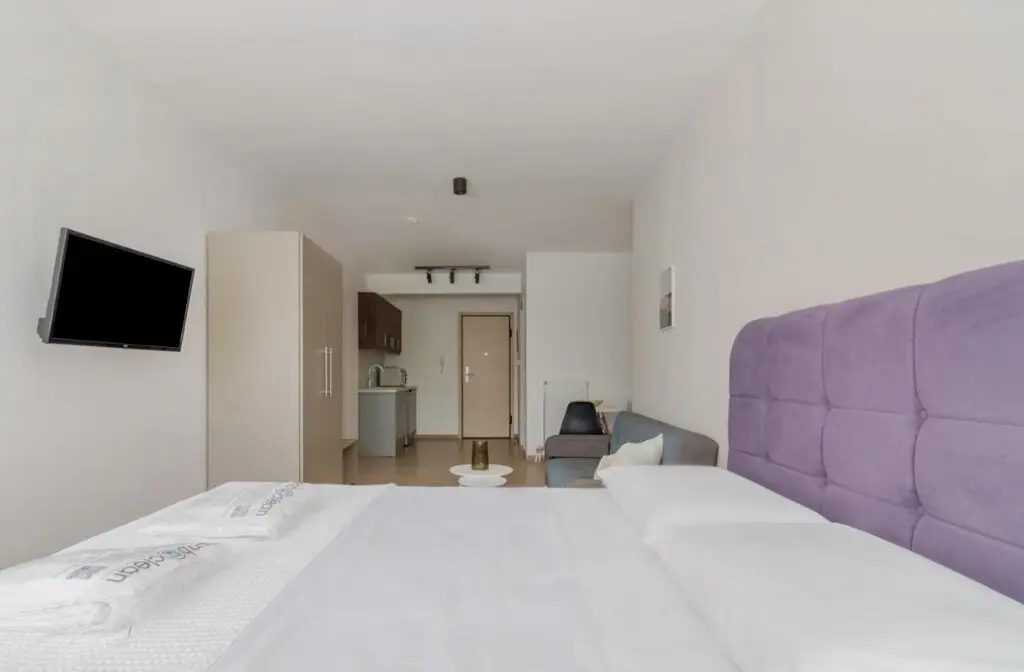 Flat has front layout. A view of the city opens up from the windows. There are: air conditioning, heating. The owners will be leaving the furniture with the sale. Building has an elevator.