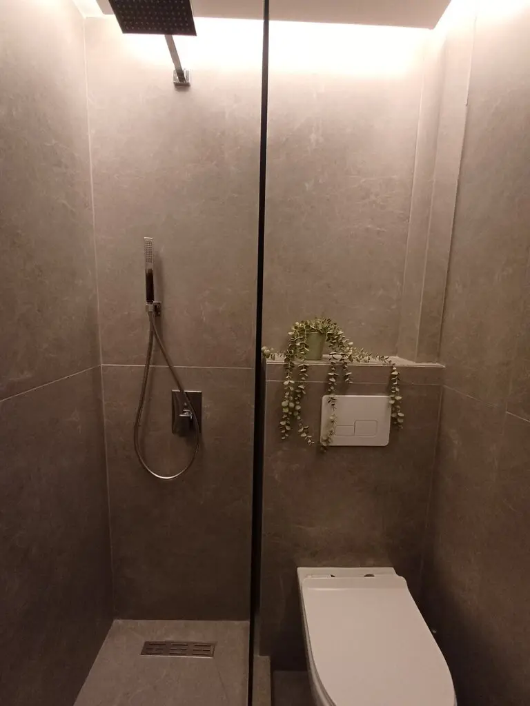 The interior of the apartment is arranged to include a living room that is combined with the kitchen area. There is also a dedicated shower room with a toilet.