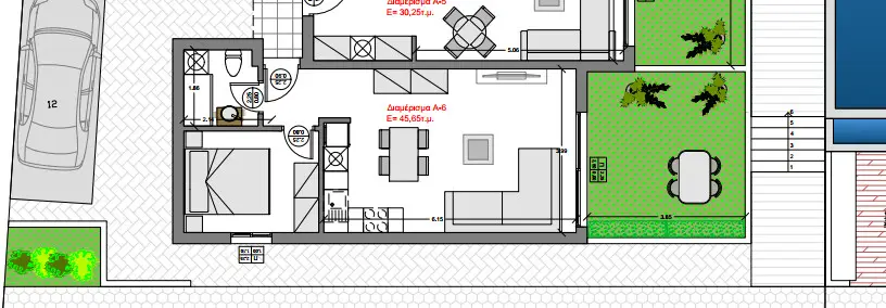 We’re looking at an apartment that’s currently under construction in Sithonia, Chalkidiki. This particular unit measures 46 square meters. It’s located on the ground floor of the building.