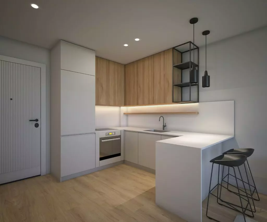 The layout includes one bedroom, a combined living room with a kitchen, and a shower WC. This design optimally utilizes the space, making it functional for everyday living. The interior has been designed for practicality, ensuring the needs of various lifestyles are considered.