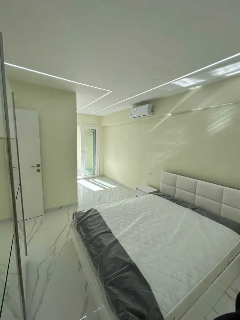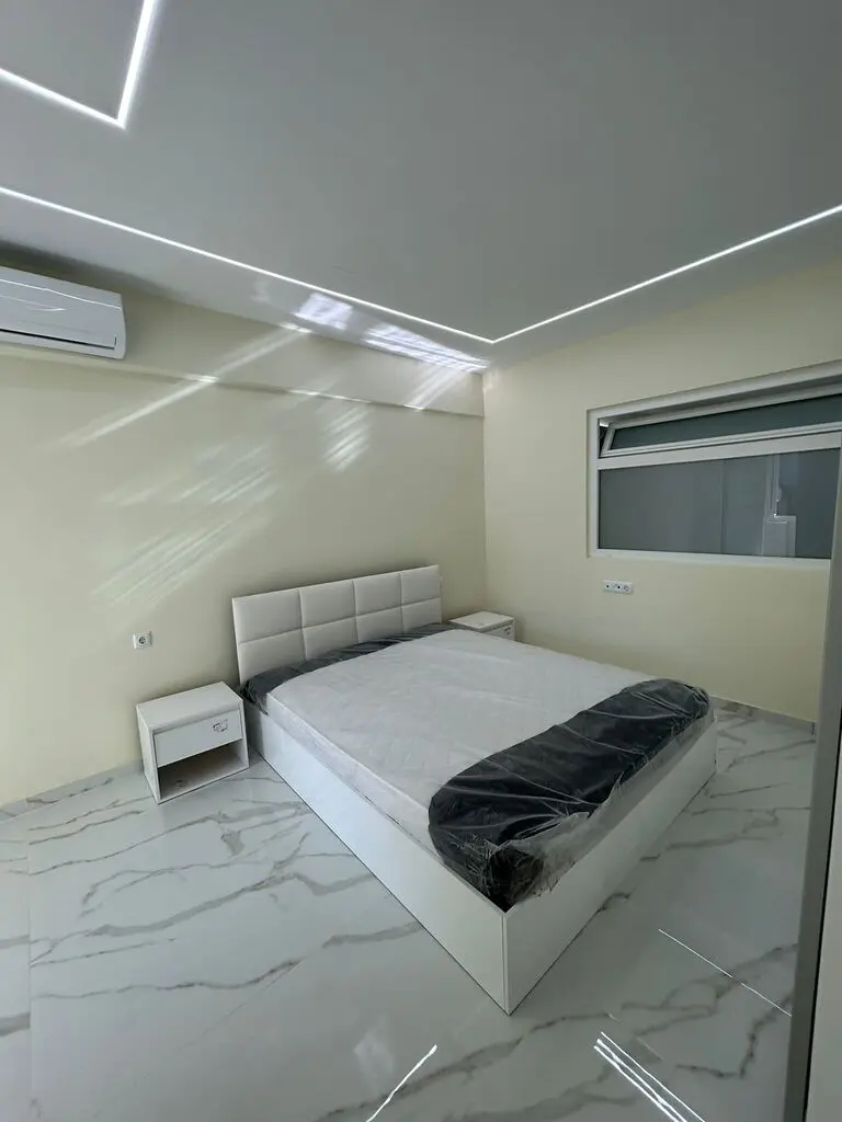 The apartment is laid out with two bedrooms, a living room, a kitchen area, and a bathroom with a shower. It benefits from a front-facing orientation. For climate control, the property is equipped with air conditioning and a heating system. A notable feature is that the current owners intend to leave the furniture in place as part of the sale.