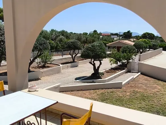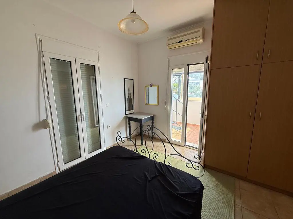 From the windows, residents can observe views of both the sea and the mountains. The property is equipped with solar panels for water heating, air conditioning, and awnings. A heating system is also in place. The current owners have indicated that the furniture will remain with the property upon sale. An additional feature of this property is the inclusion of a parking space.