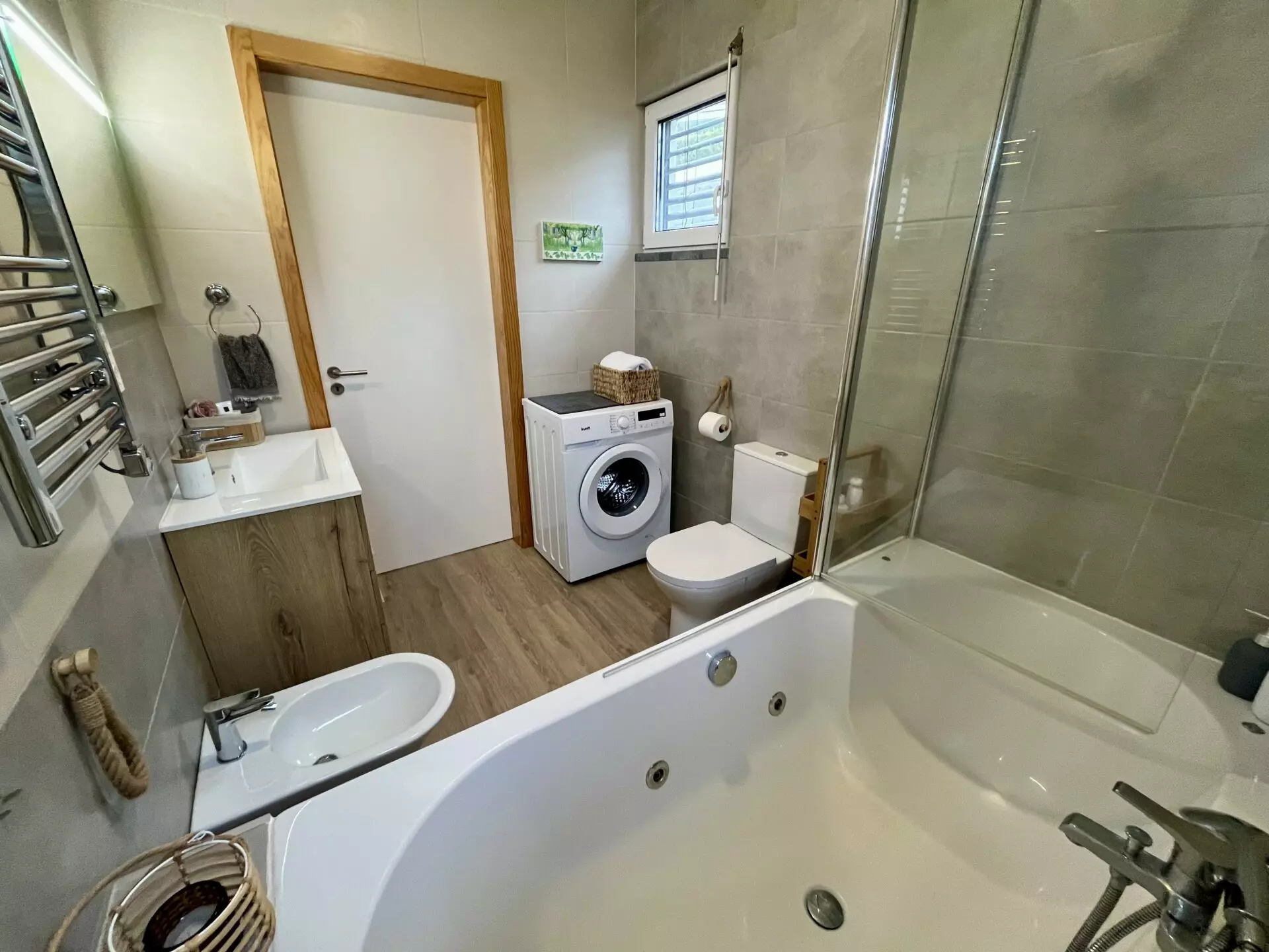 The rear section of the house is designed as a private suite with its own entrance. This suite has a bathroom equipped with a whirlpool bathtub and access to its own private terrace patio, enclosed with double-glazed glass. In front of the house, a veranda area is partially enclosed with an aluminum and glass structure, connected to the main entrance. This provides an added comfortable and practical space, especially useful when the weather is less favorable.