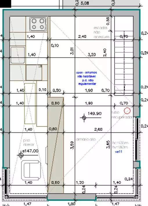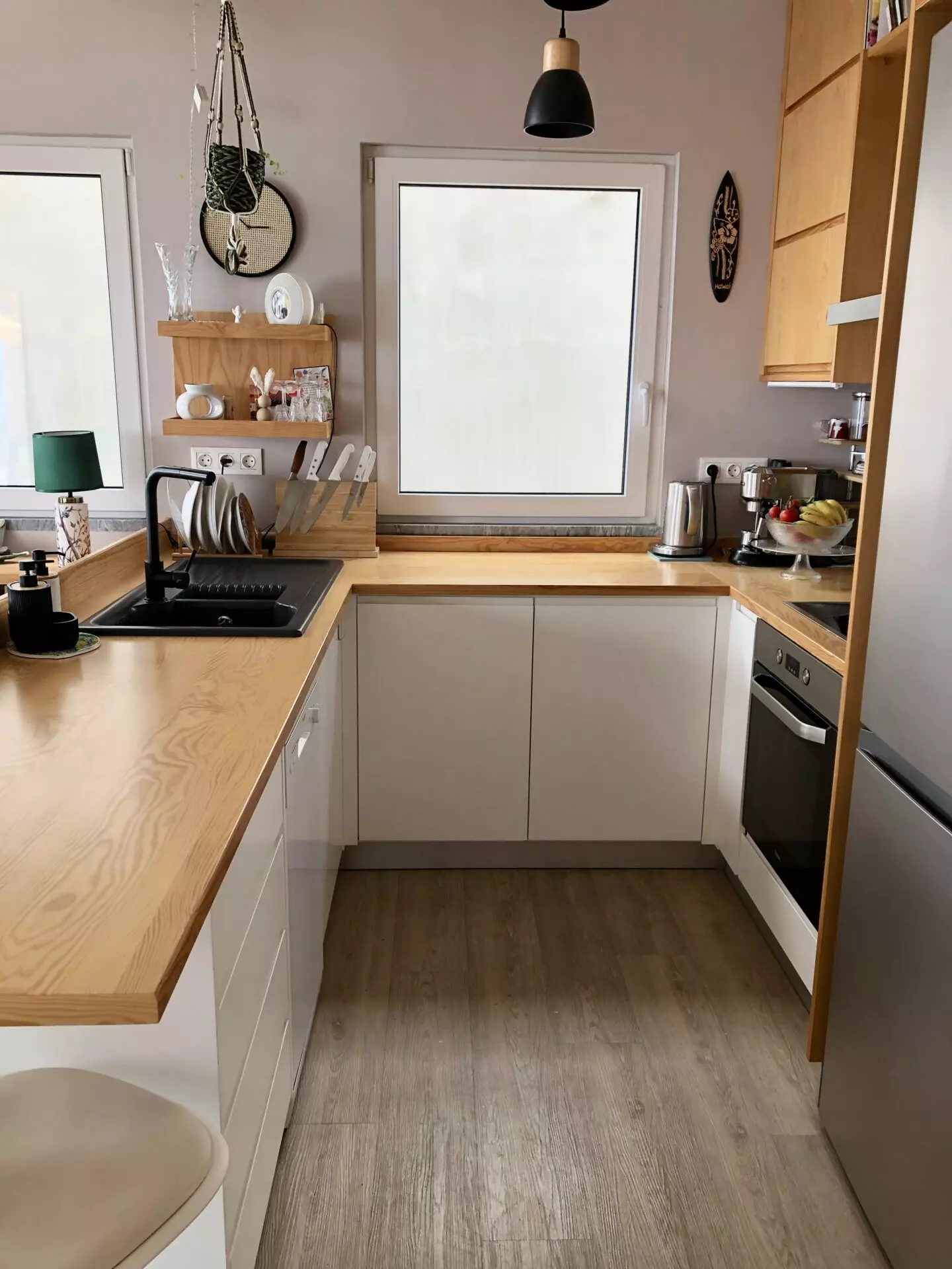 - A fully equipped “U” shaped kitchen with extra storage built under the mezzanine stairs (which have a sloped section of 240 cm).
