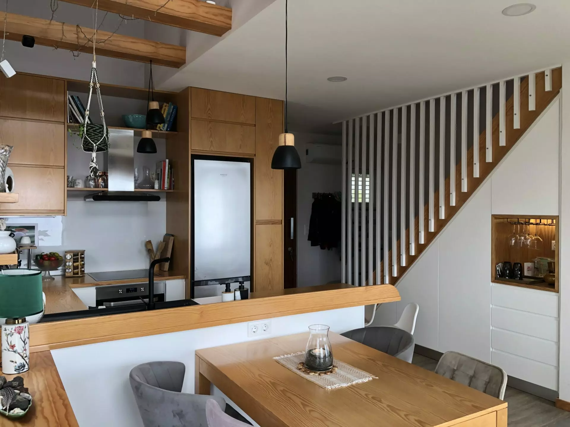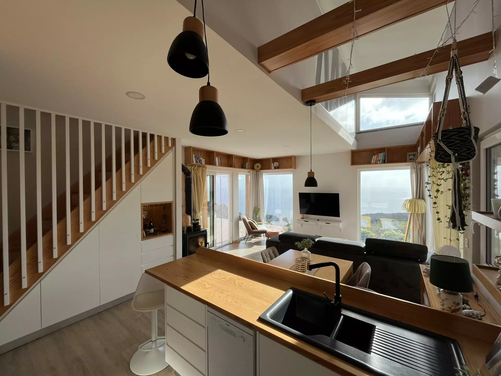 The interior is styled in a contemporary design, featuring predominantly custom-made pine wood furniture, natural materials, a cozy atmosphere, and functional living solutions. Energy-efficient water heating and preparation for a solar system on the garage rooftop reflect future-ready sustainability.