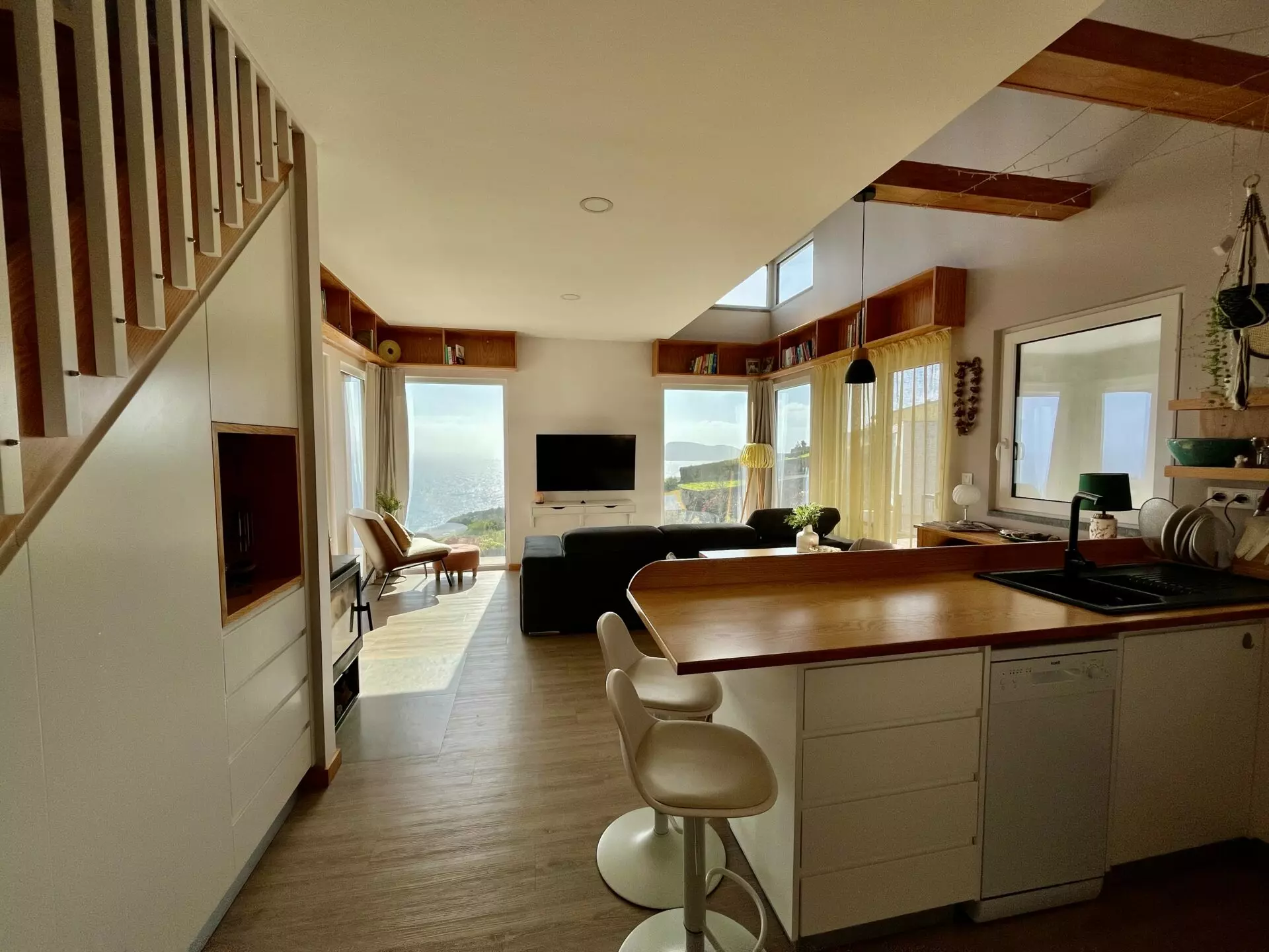 This outdoor space is suitable for dining, relaxing, practicing yoga, holding barbecues, or entertaining guests, all while enjoying the views of the island. It’s set up for use throughout the year. The barbecue area has direct access to the kitchen via a sliding door or can be reached from the garage.