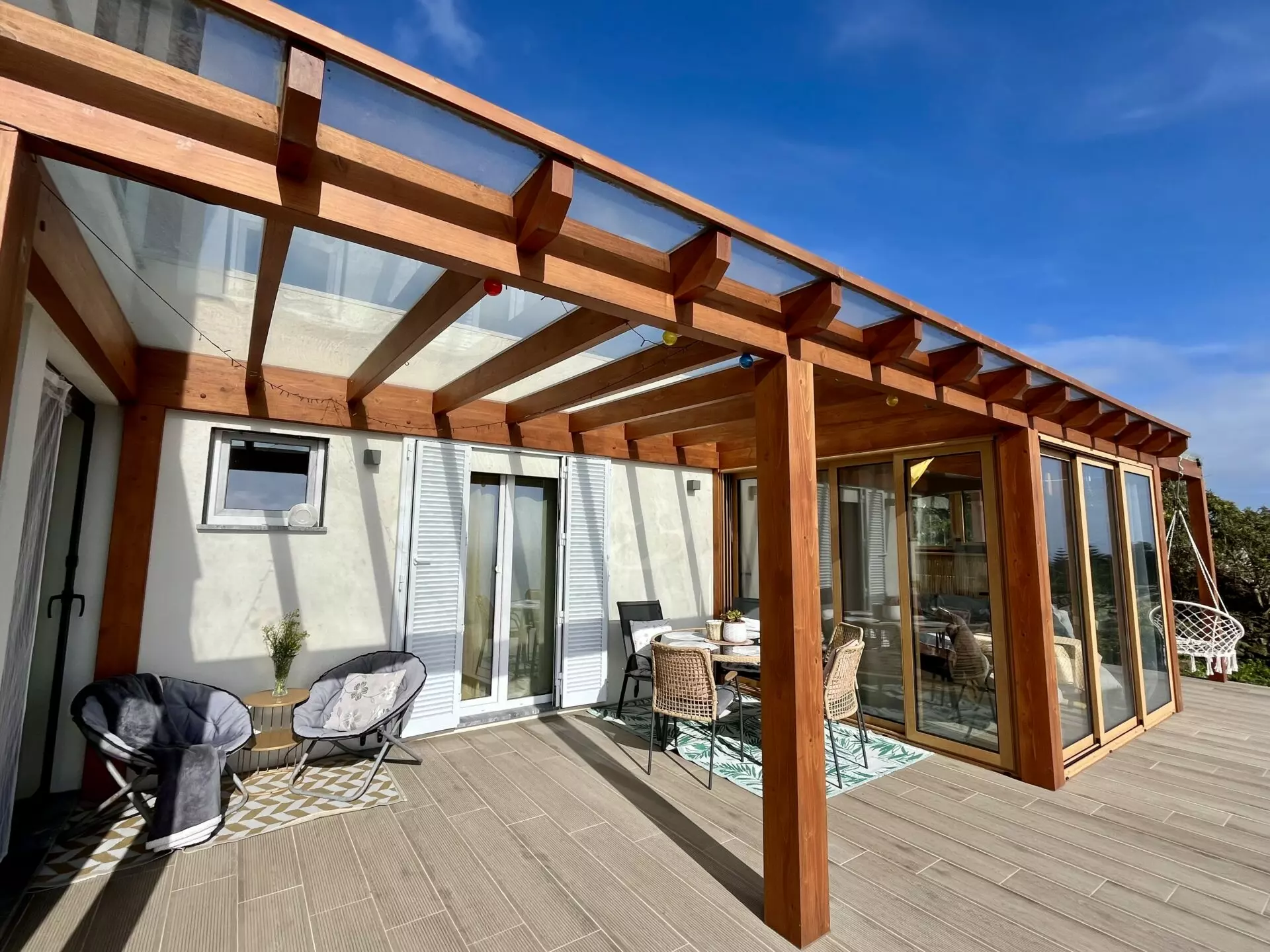 The terrace, facing southwest, is designed to be accessed from all rooms. It’s partially covered by a wooden structure with a laminated glass roof (17 m²) and partially enclosed with sliding aluminum double-glazed windows (10 m²). This creates a flexible and inviting patio area that can be used in various weather conditions.