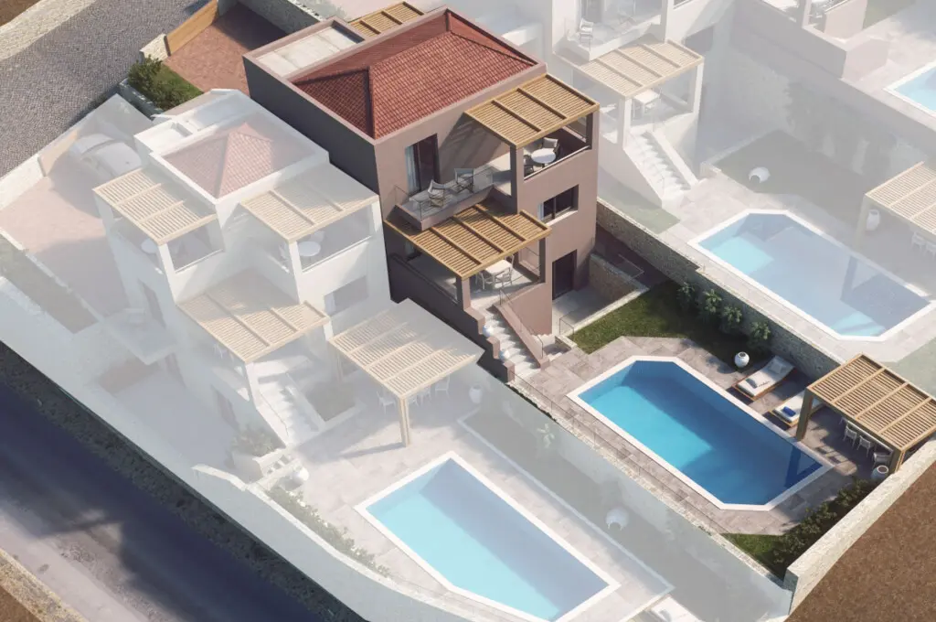 For sale 3-storey villa of 163 sq.meters in Crete. Semi-basement consists of 2 bedrooms, one shower WC, one storeroom.