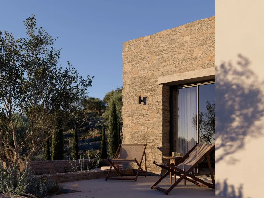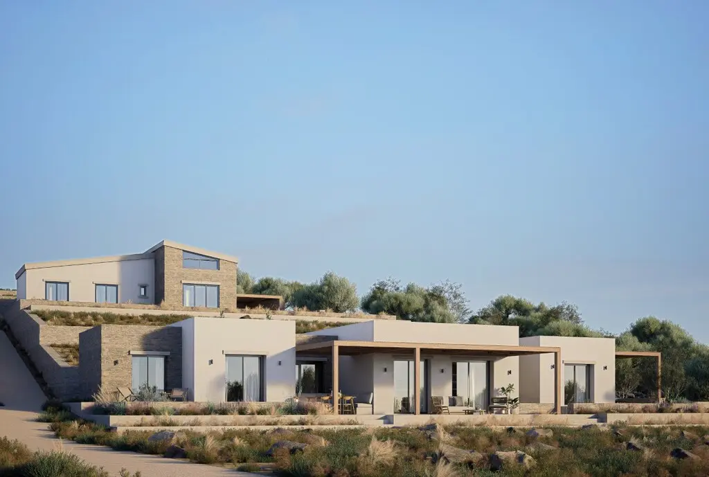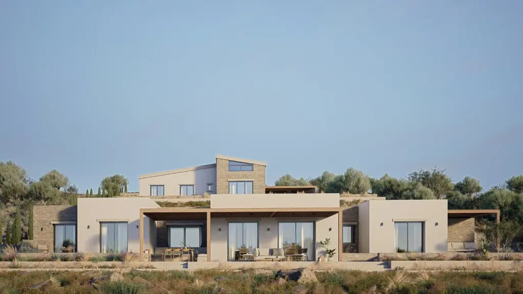 We’re looking at a property currently being built on the island of Crete. This is a two-storey villa with a total of 220 square meters of living space. It’s located in an area that offers views of the city, the mountains, and the forest.