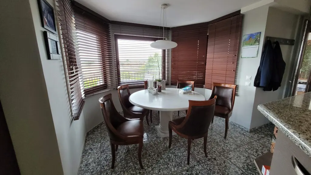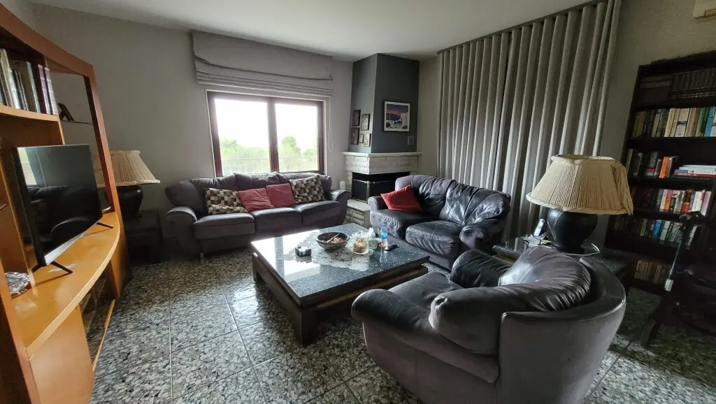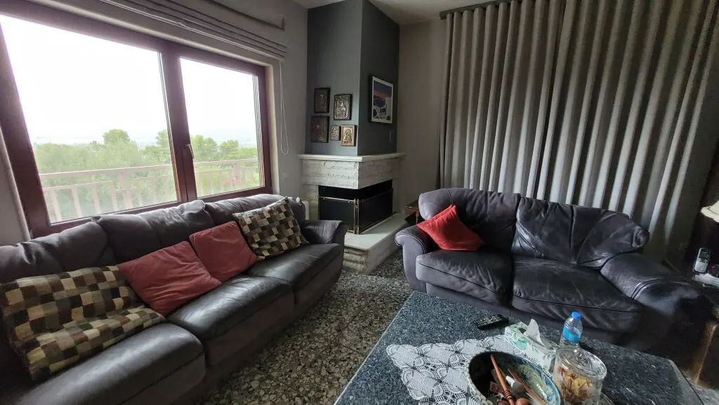 For sale 3-storey villa of 475 sq.meters in the suburbs of Thessaloniki. Semi-basement consists of one bedroom, living room with kitchen, one bathroom, one storeroom, one office.