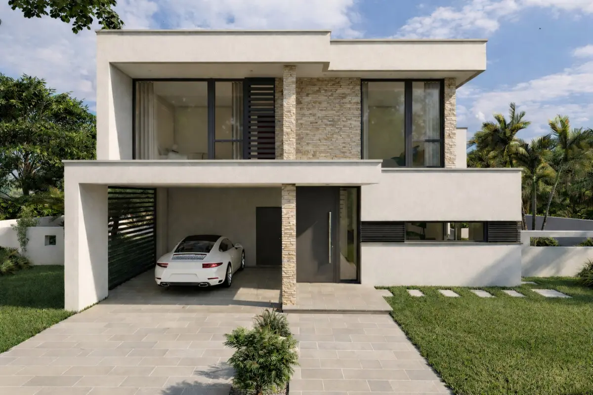 This villa concept focuses on modern aesthetics and functionality. The layout is open-plan and has a double-height living area that utilizes large windows, allowing plenty of light to fill the space. The outdoor area effortlessly connects to the indoor living space, ideal for enjoying the terrace and pool.