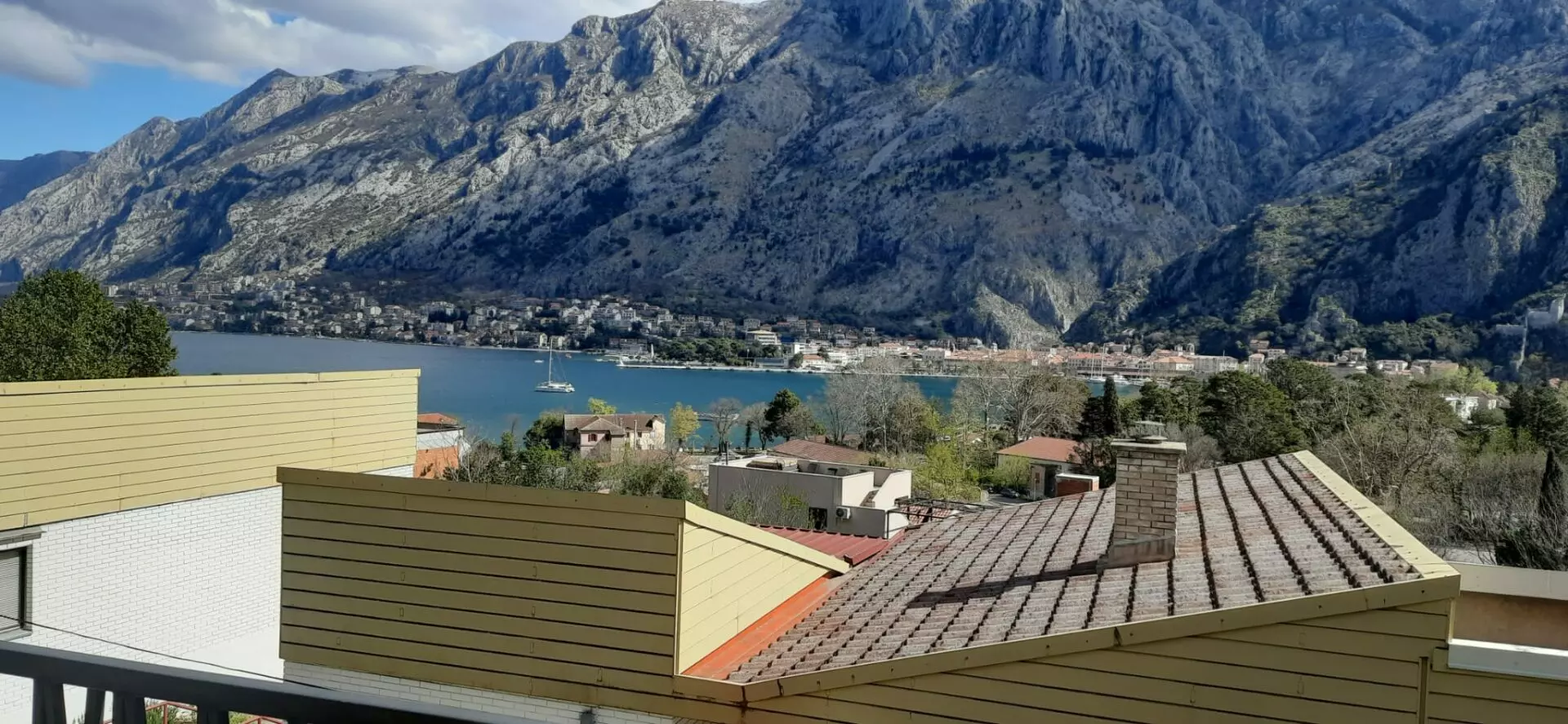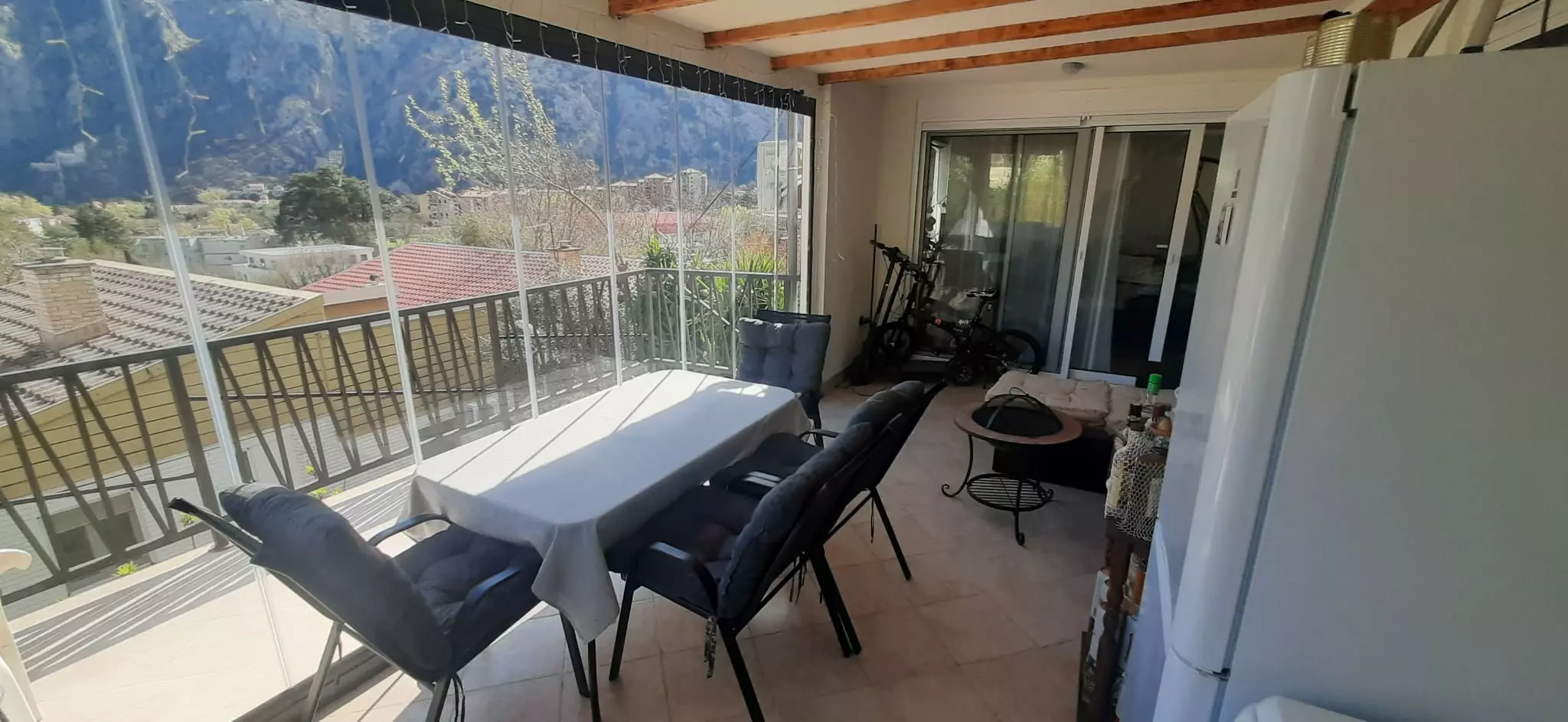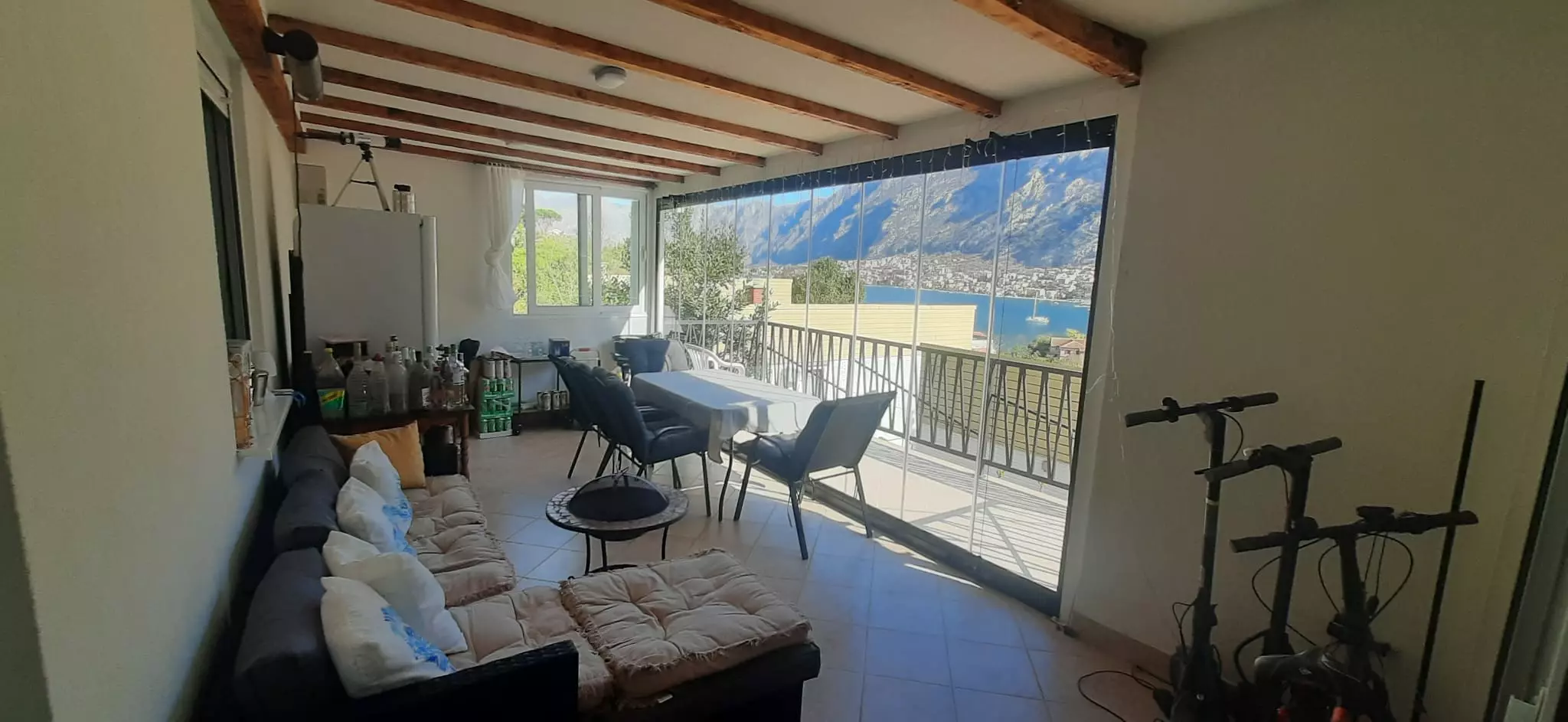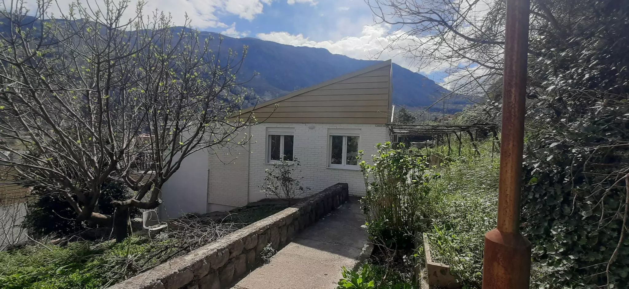 This is a functional house covering approximately 128 square meters. It is situated a 15-minute walk from the old city center. Essential amenities, including the coastal road, a children’s playground, a hospital, a police station, a city park, a bakery, a cafe, a gas station, a sports center, and an indoor swimming pool, are all within a 5-minute walk. The property is located away from the immediate city center, surrounded by greenery. It offers unobstructed views of the mountains and the sea, with a direct overlook of Kotor Fortress.