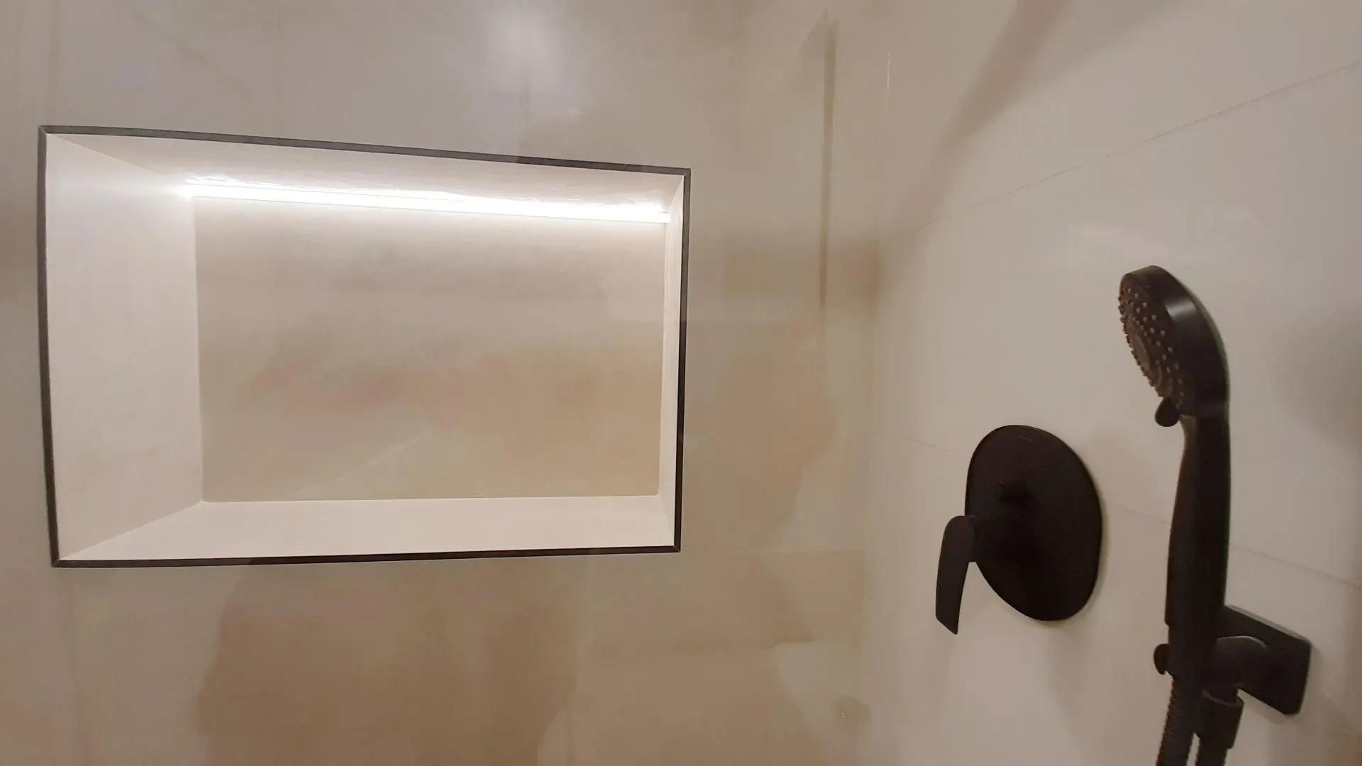 • Bathrooms: Toilets with slow-close seats, white resin shower trays, built-in black matte faucet fittings, custom-made black matte shower screens, and suspended storage furniture.
