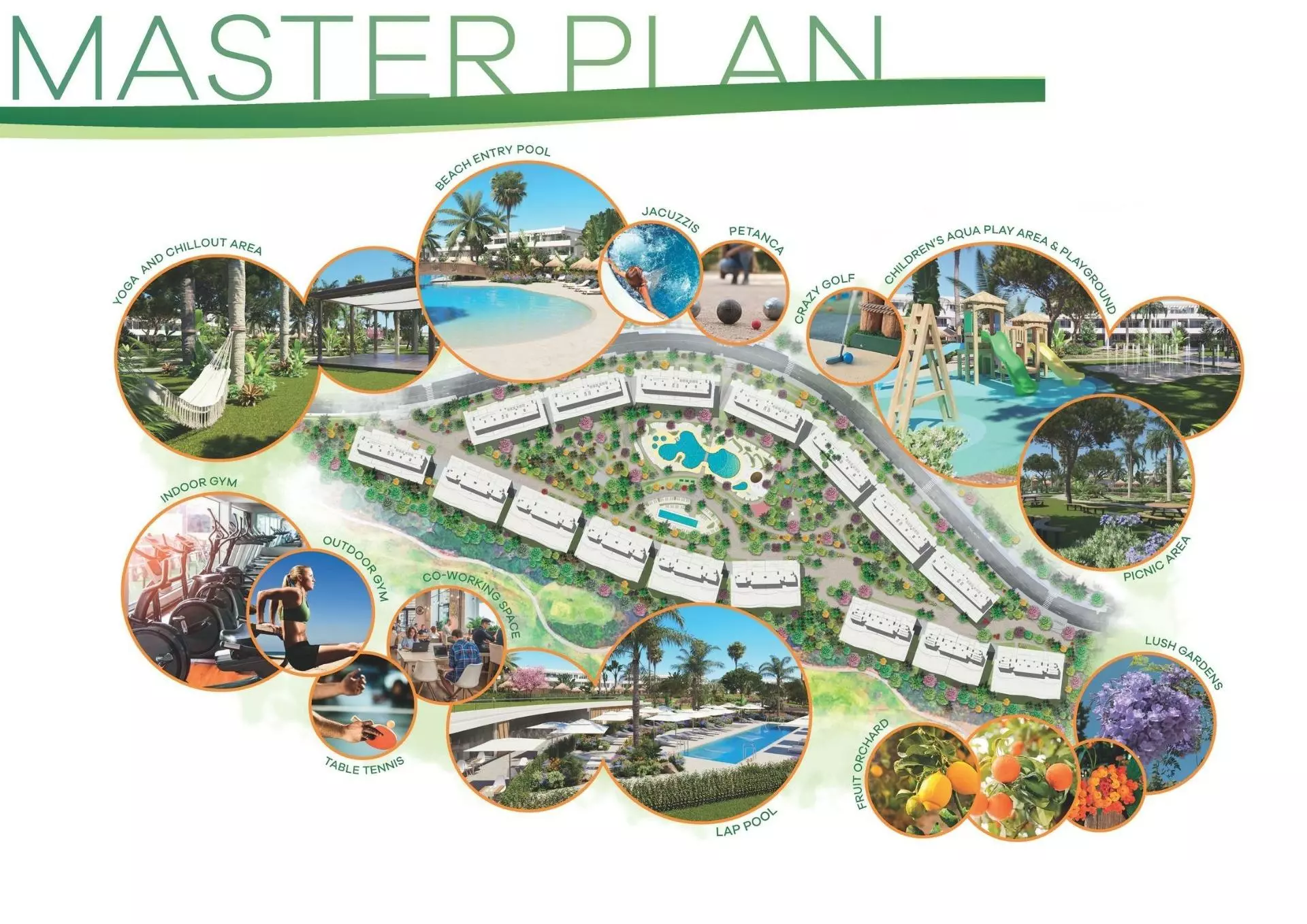 Each apartment in the complex showcases contemporary architecture and a thoughtful layout. All units feature a variety of configurations to suit different family needs. Surrounded by landscaped gardens, these homes offer clear views of the Mediterranean Sea and the adjacent La Hacienda Links Golf Resort, enhancing the living experience.