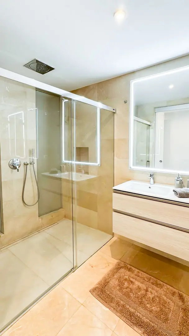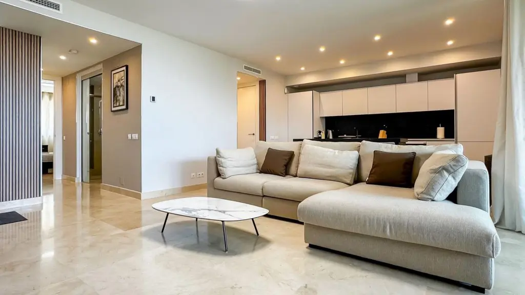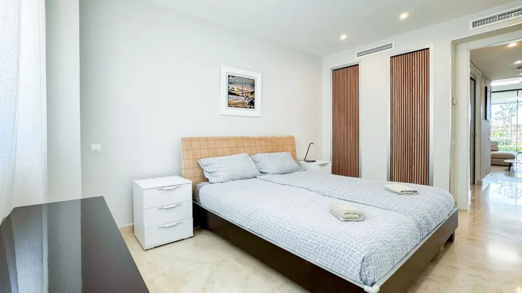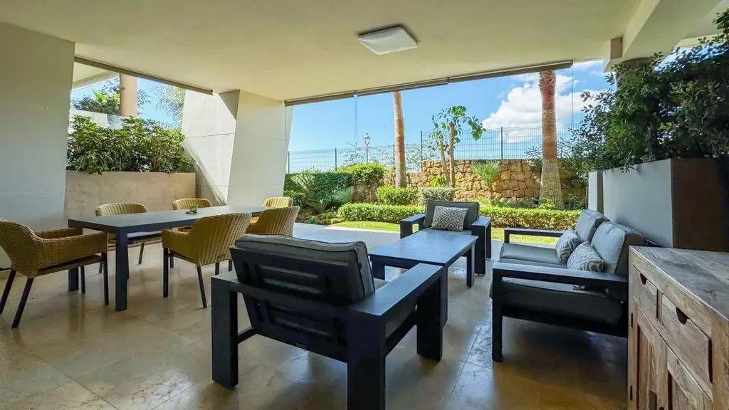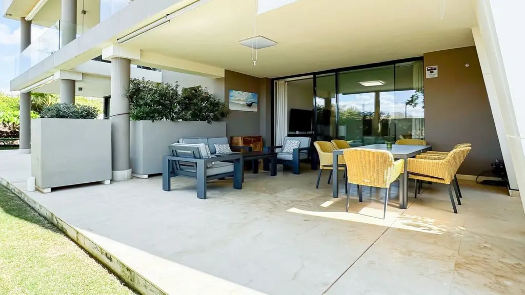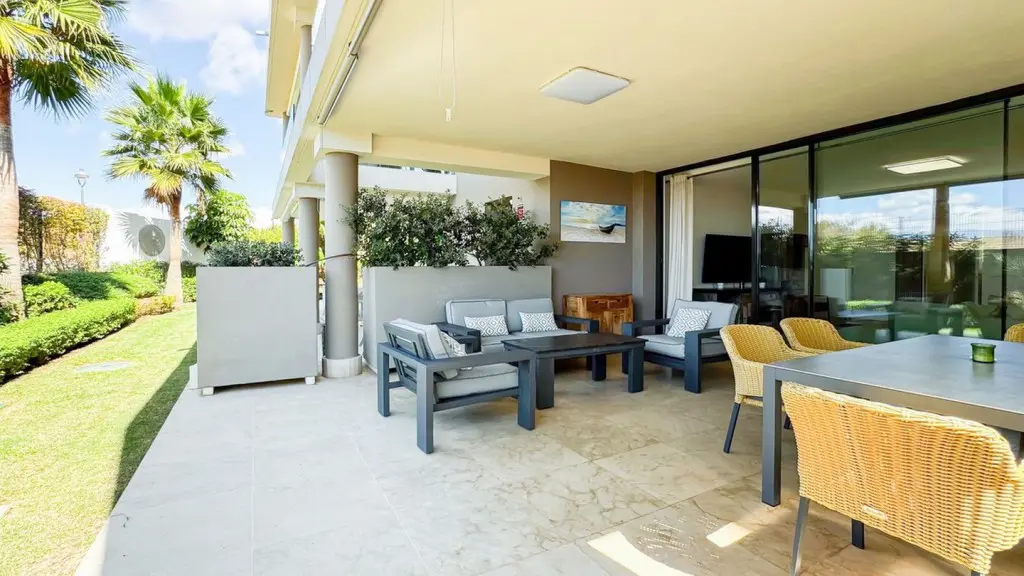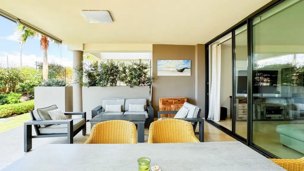 Discover this bright and elegant ground-floor apartment in La Montesa de Marbella (Cabopino), where contemporary architecture blends perfectly with the relaxed lifestyle of the Costa del Sol. Designed to offer the feeling of living in a villa, the property seamlessly connects indoor and outdoor spaces through floor-to-ceiling sliding glass doors that open fully onto a spacious terrace, covered porch, and private garden.