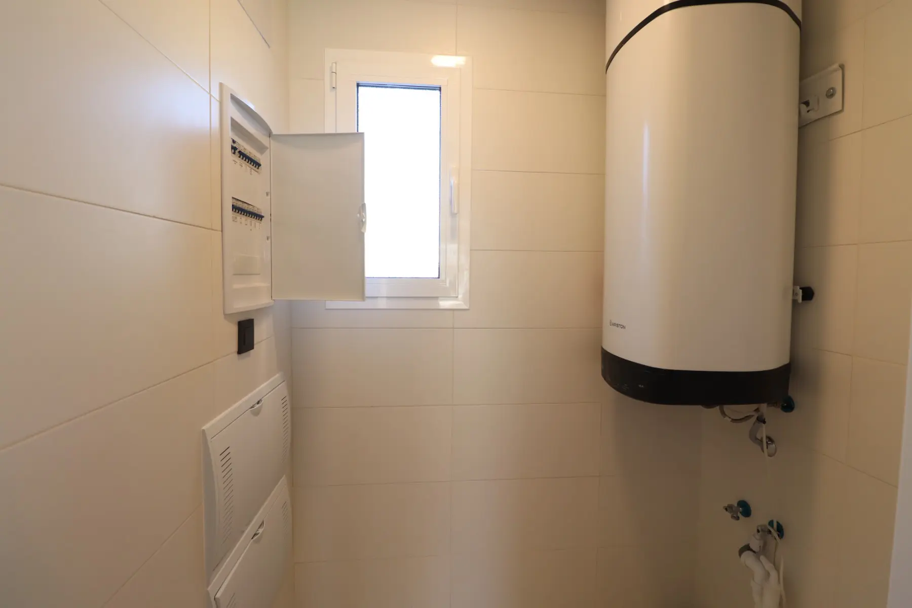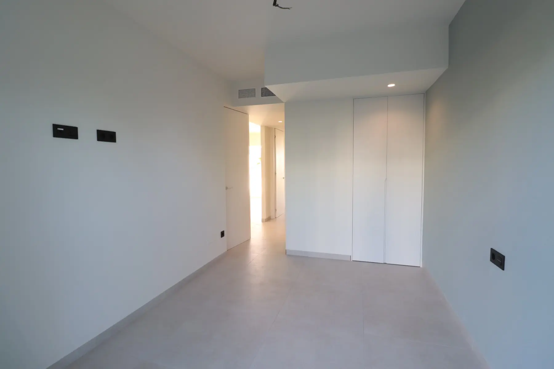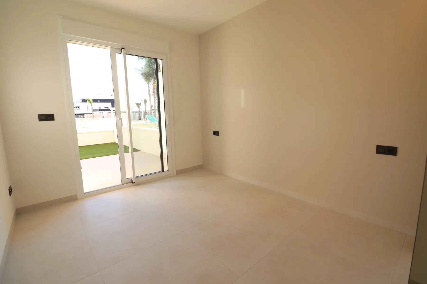 This apartment, only 7 months old, showcases a contemporary design. It includes an open-plan, fully fitted kitchen equipped with modern finishes and USB plug sockets. The kitchen is complemented by a separate utility room, enhancing daily functionality. The living room is fitted with air conditioning and opens onto a terrace that features artificial grass, providing a pleasant area for relaxation with views of the communal pool and surrounding areas.
