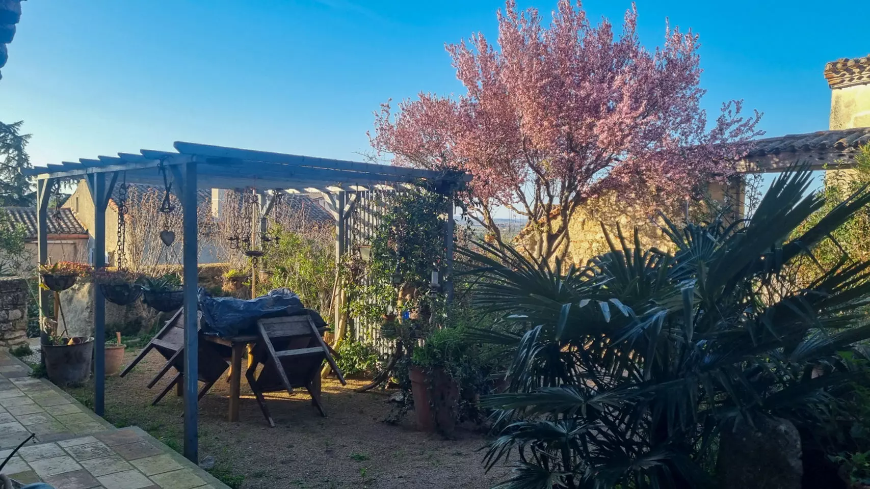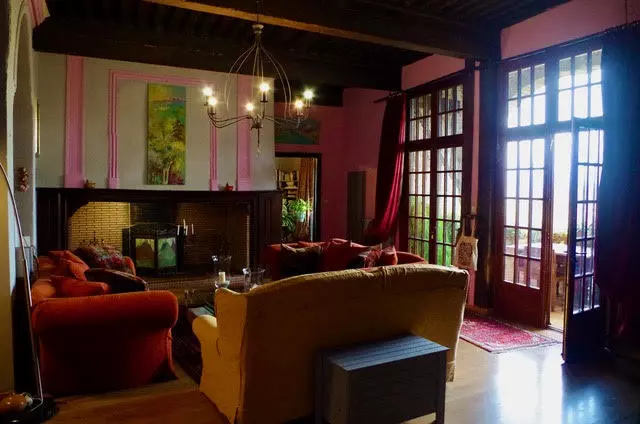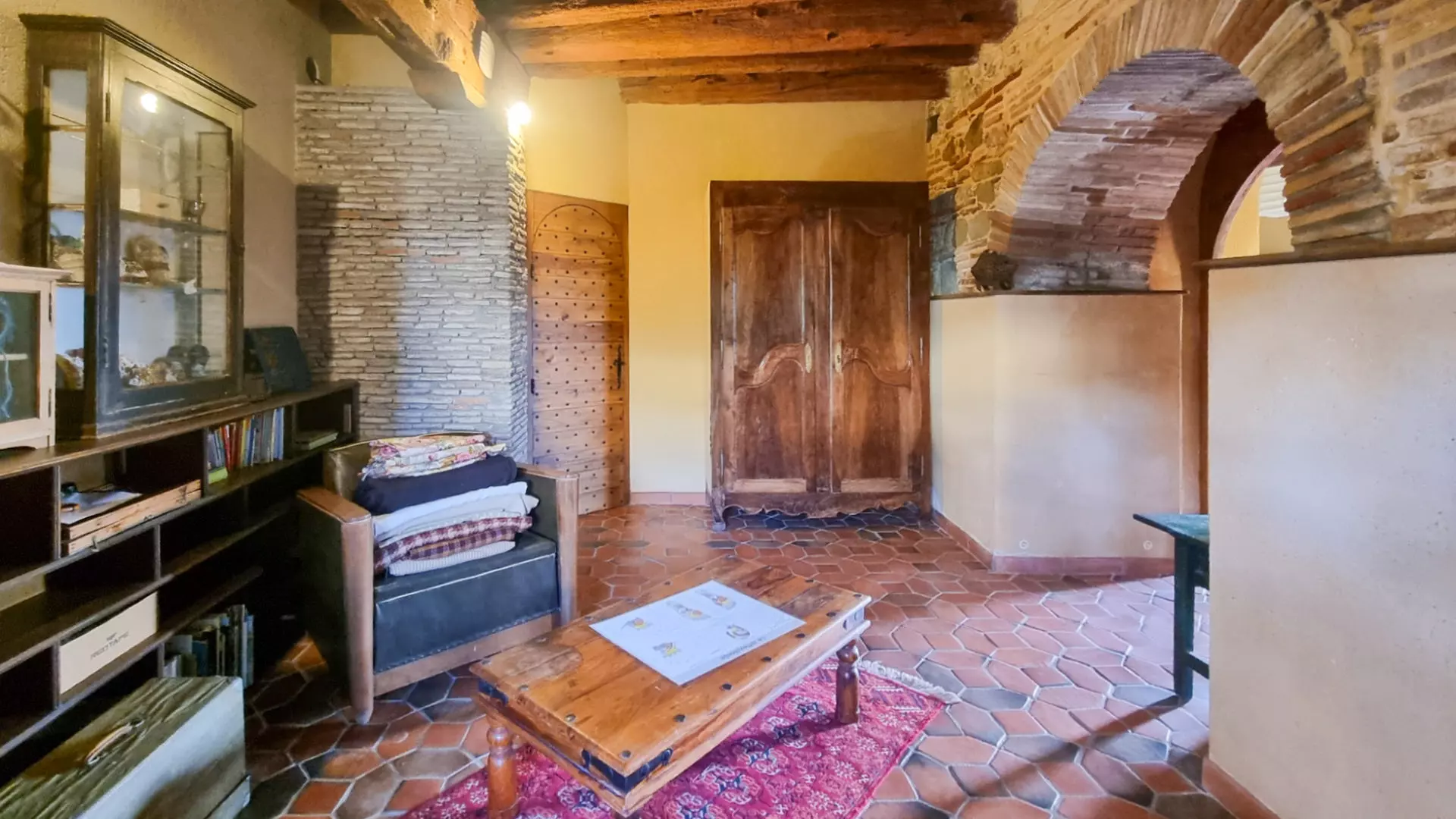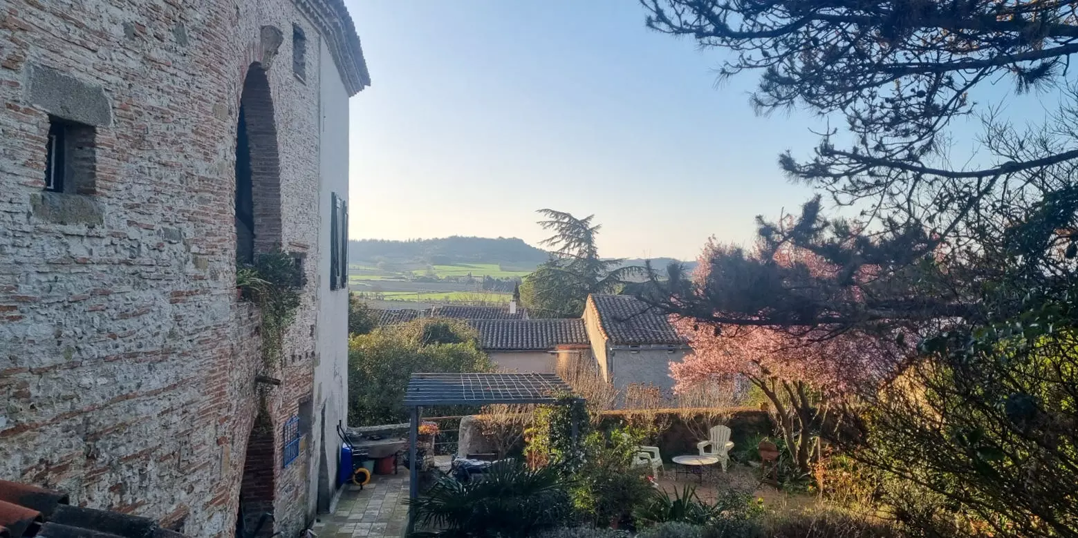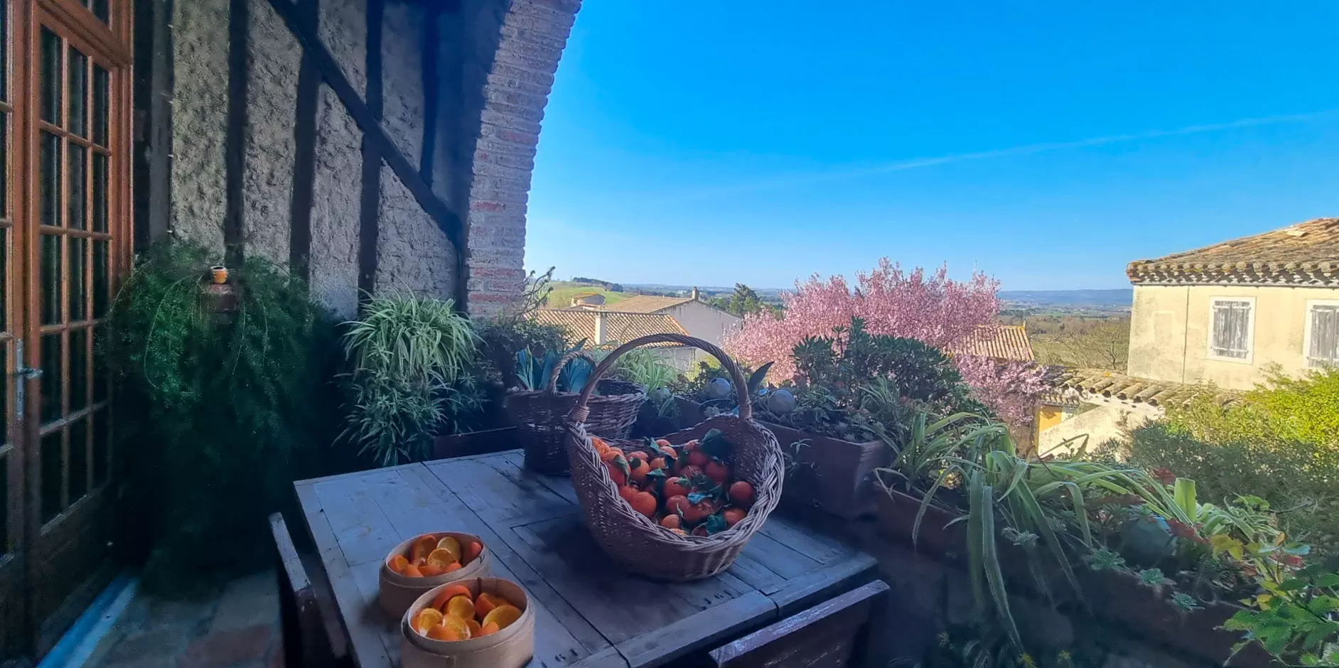 The main living area includes a sunlit living room equipped with a traditional wood-burning fireplace. This space opens onto a panoramic loggia that offers views of Lauragais.