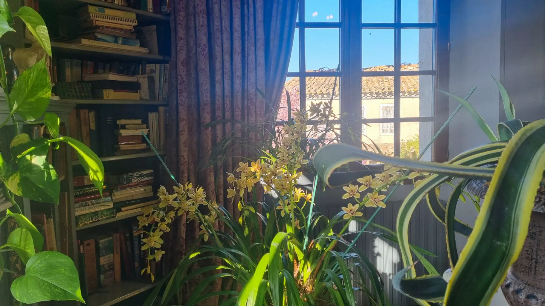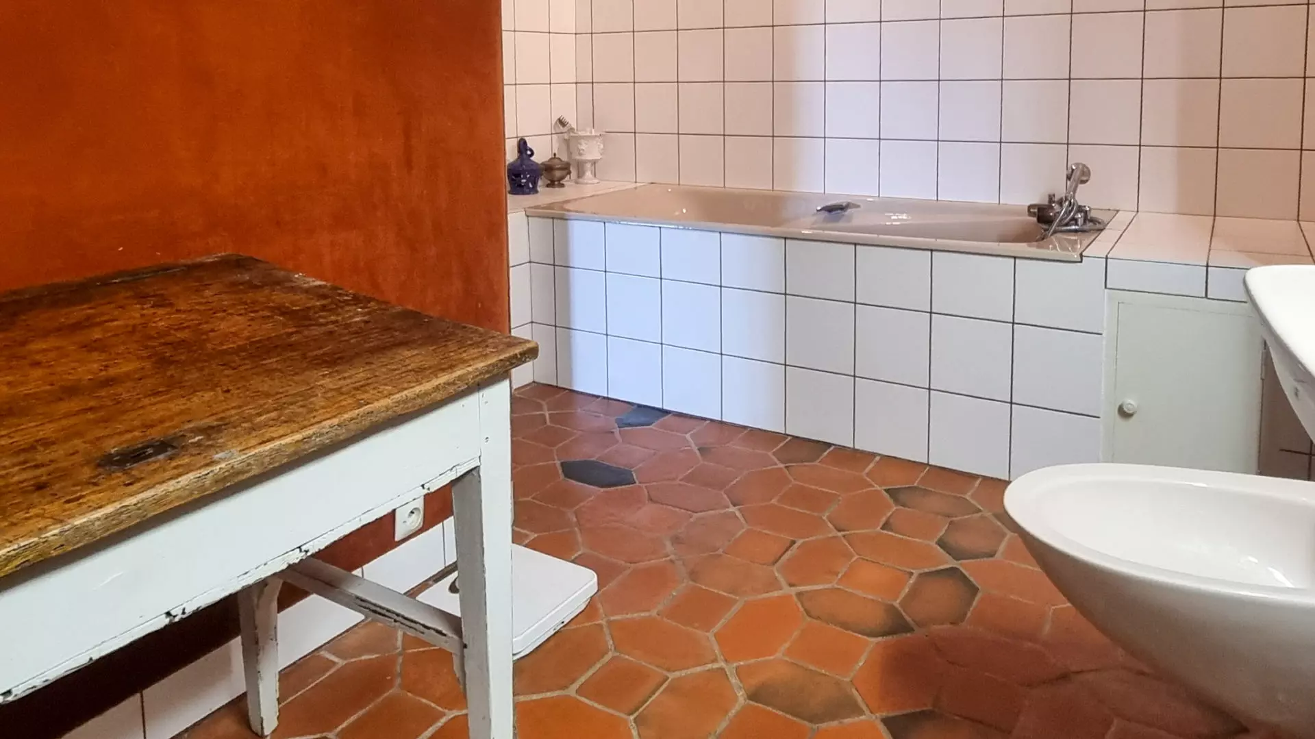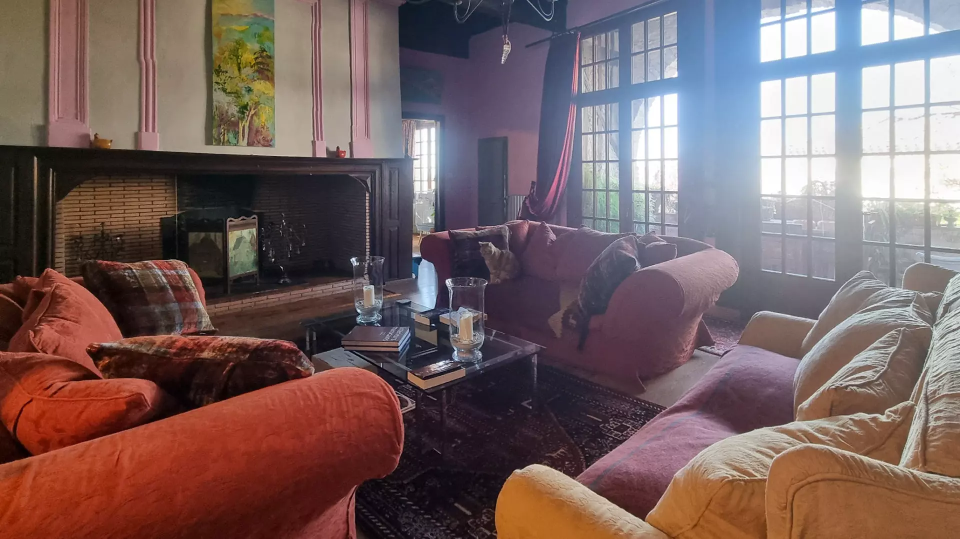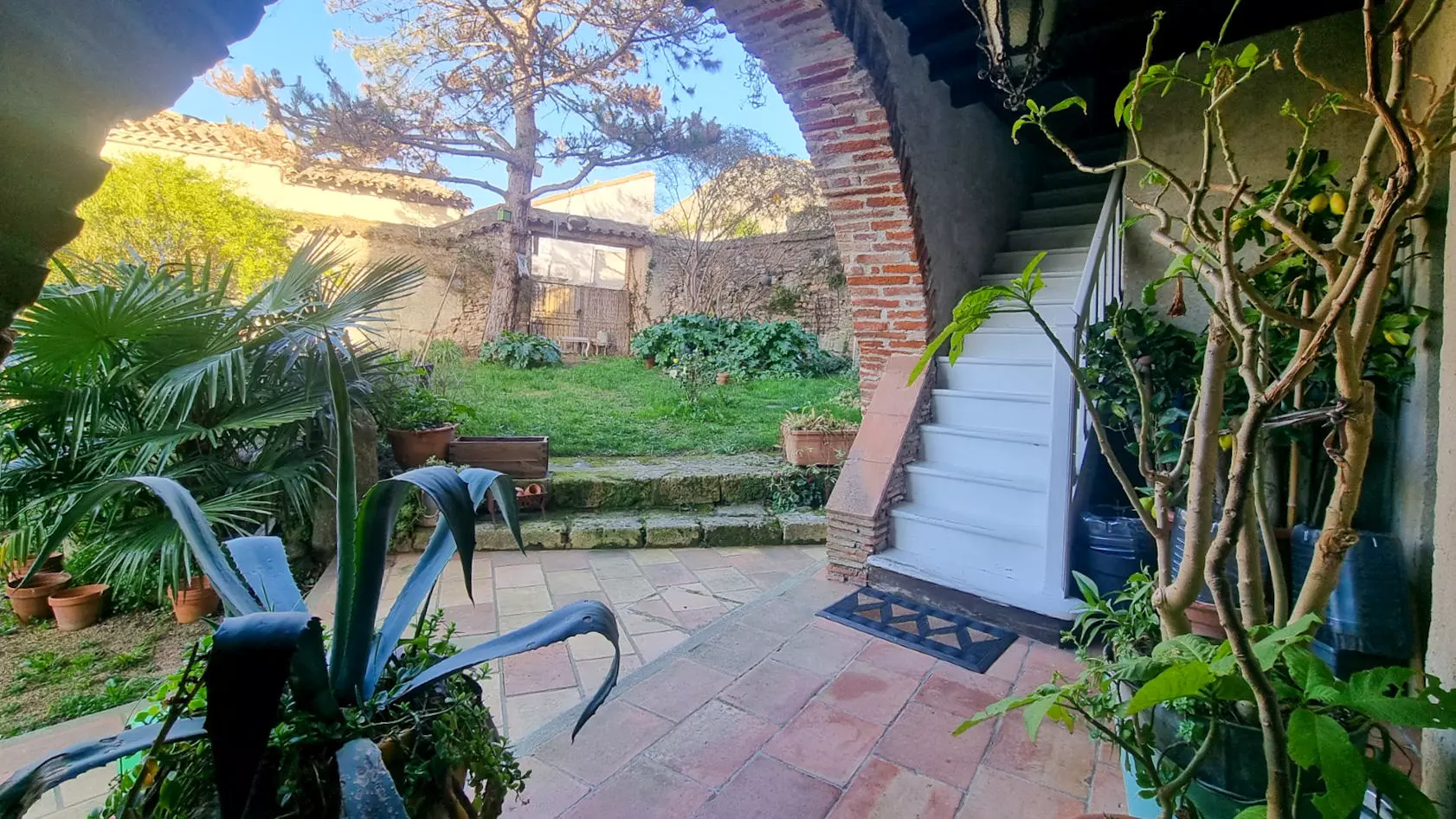 The main living area includes a sunlit living room equipped with a traditional wood-burning fireplace. This space opens onto a panoramic loggia that offers views of Lauragais.