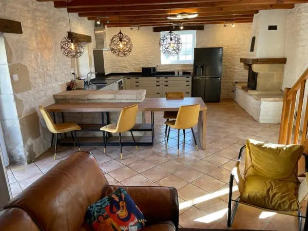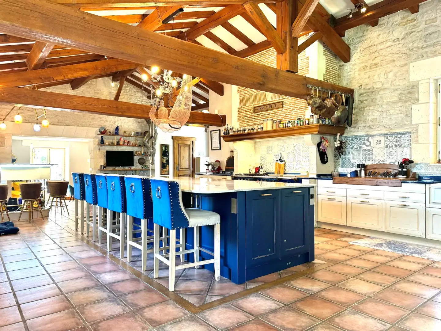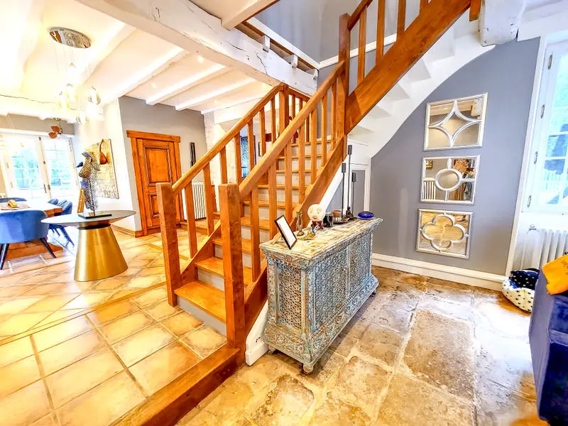 The current owners have carried out an impressive renovation of the mill. Both the historic elements and modern conveniences are seamlessly integrated, creating an environment that supports daily activities and gatherings. The restorations have included high-quality kitchens and spacious dining areas, some of which offer outdoor settings with river views. The main living space, combined with the dining room, provides ample area for entertainment or relaxation.