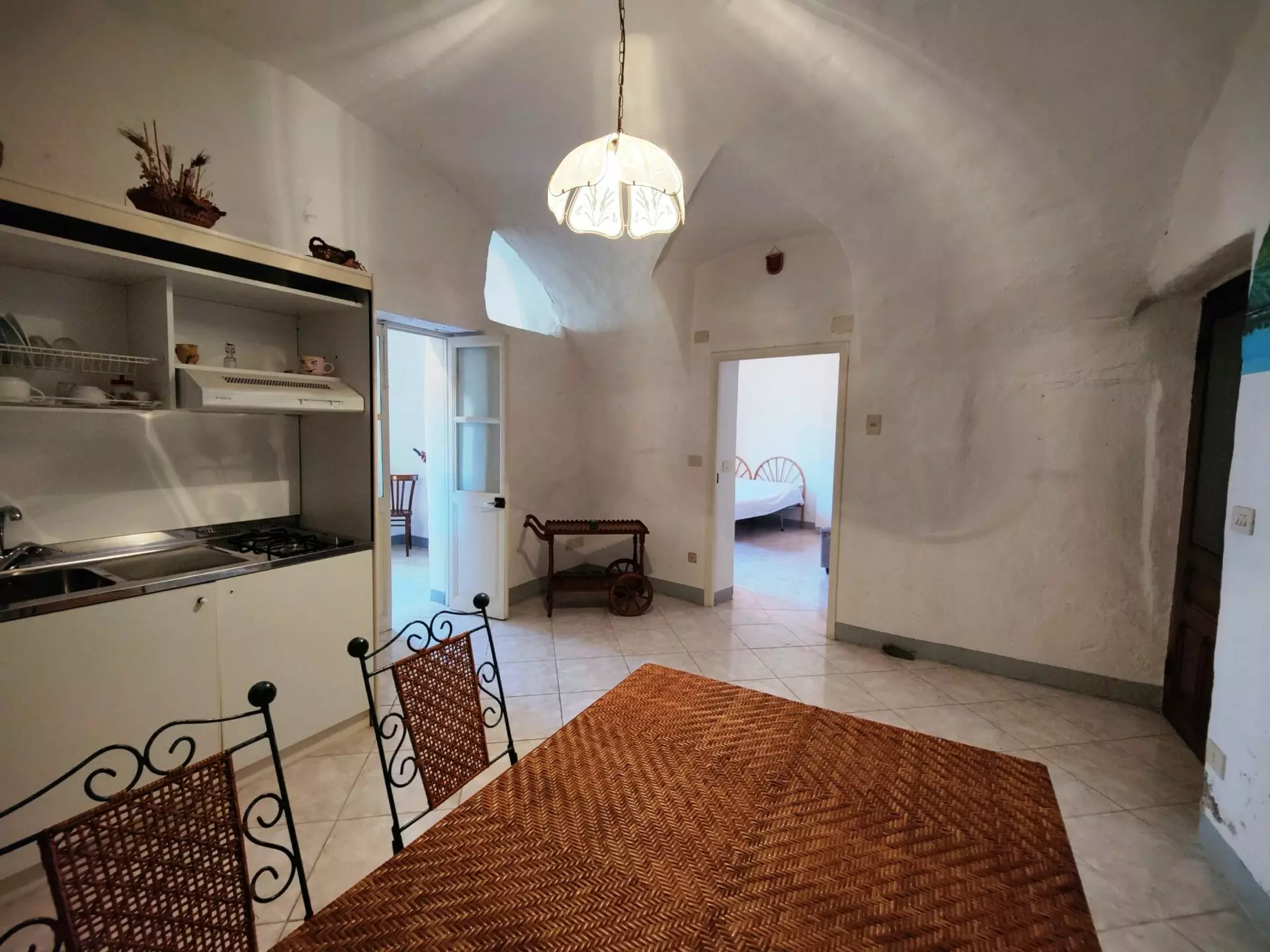 - The entrance opens into a living area with a kitchenette, providing a functional layout.