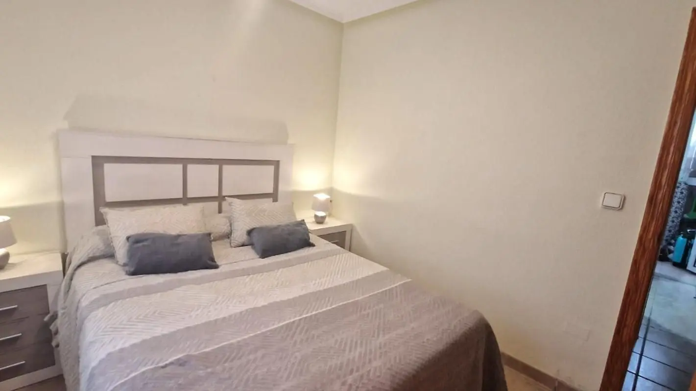 Spacious two floors semi-detached house in very good condition in a beautiful Residential in Aguas Nuevas, approximately 1 km from the magnificent beach of La Mata! On the ground floor, there are a large living room, a fully equipped independent kitchen, a bedroom with built-in wardrobes and a bathroom with a shower. The living room has access to the large terrace with garden, barbecue, plants, overlooking the swimming pool. On the first floor, there are two double bedrooms with built-in wardrobes and a bathroom with a bathtub. And the solarium is accessed by an internal staircase. Furnished. Air conditioning. Optional: large closed garage (18 m2) in the community basement: 15.000€ All located in a closed Residential complex with swimming pool and gardens, close to all amenities, cafeterias, restaurants, bus stop, and so on. Perfect to live all year round or spend holidays to enjoy the good Mediterranean climate and the beach!