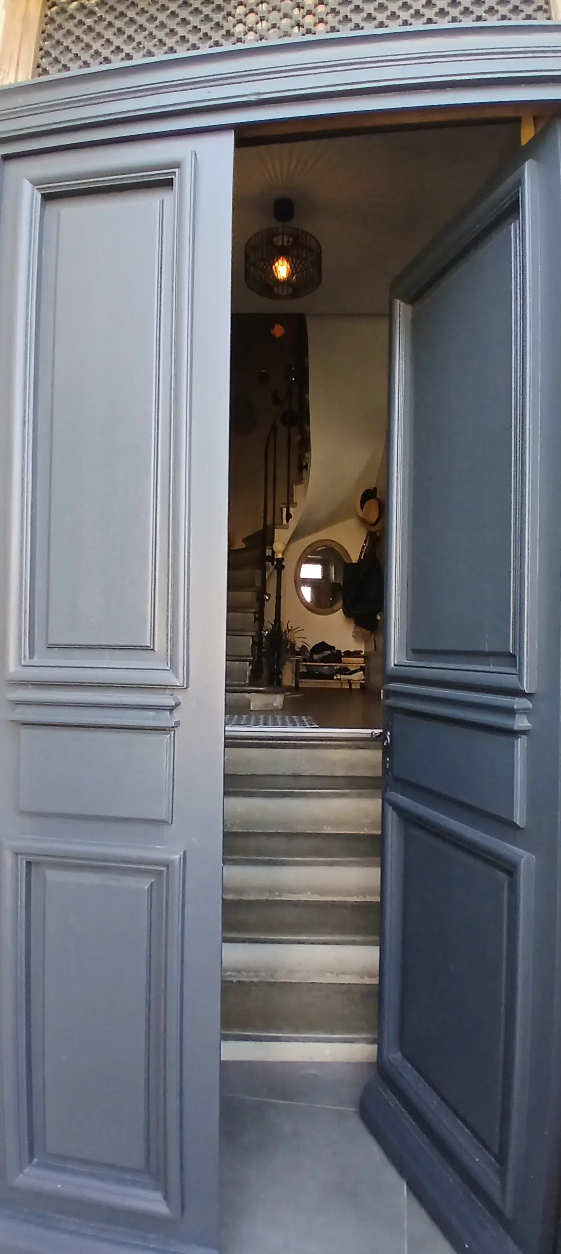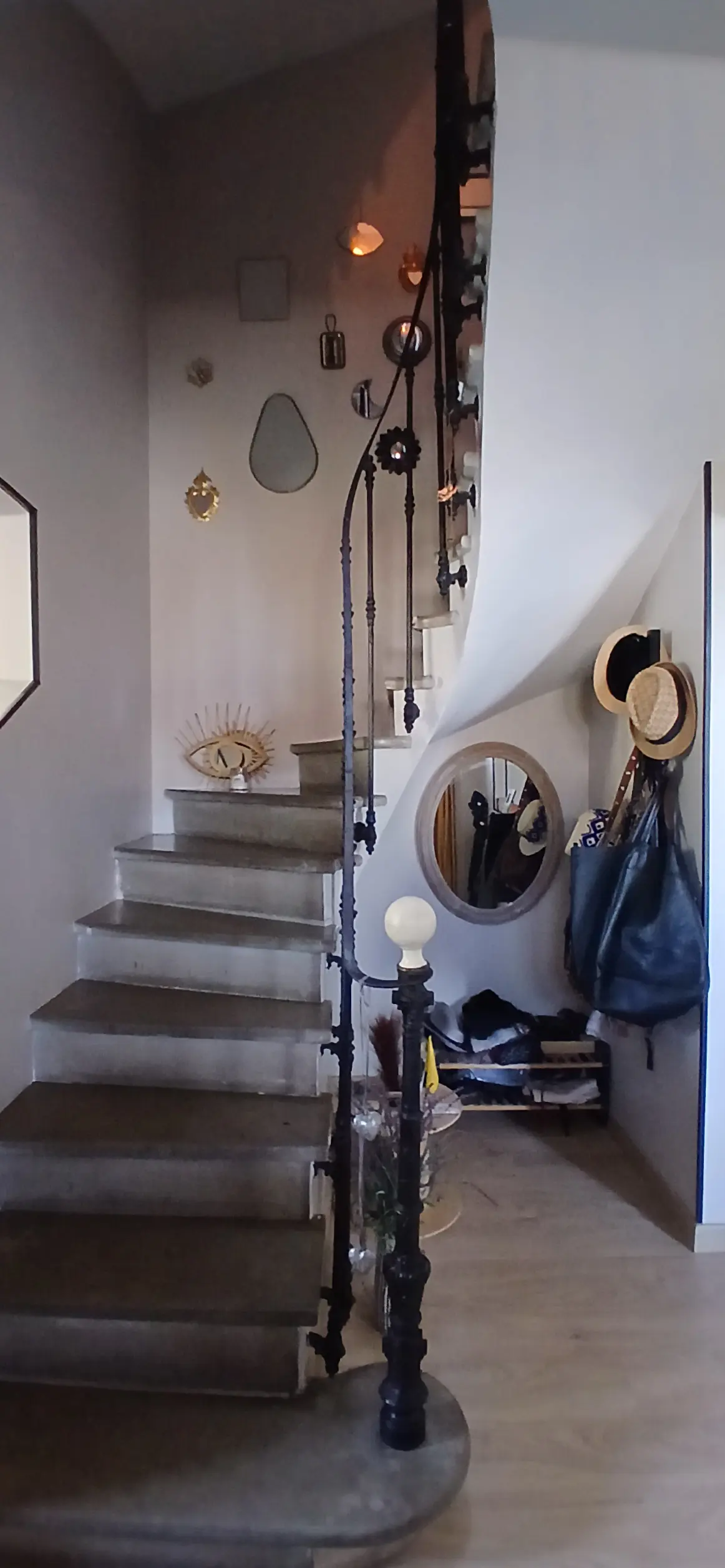 Let’s break down the space floor by floor. The basement is where you’ll find that substantial 108 square meter garage. Moving up to the ground floor, there’s the 15 square meter terrace, which is private and faces east. You also have a laundry room of 7.73 square meters with a sink. The entrance hall is 9 square meters and features a prominent original stone central staircase. The living room is 16.37 square meters and has French doors leading out to the terrace. The kitchen is 13 square meters and is fully equipped with wall and base units, an electric oven, a ceramic hob, an extractor hood, a double sink, and a dishwasher. It also has access to a balcony.