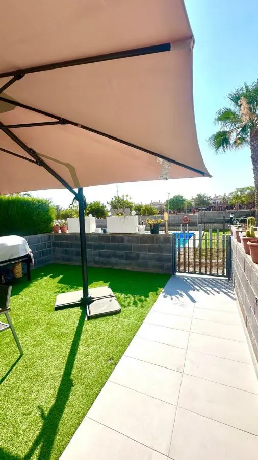 Townhouse in Aguas Nuevas with Pool Views, Terrace, and Private Solarium Located in one of the most sought-after areas of Torrevieja, this charming townhouse in Aguas Nuevas stands out for its spaciousness, light, and excellent direct views of the communal pool. Ideal both as a primary residence or as a second home to enjoy the Mediterranean climate in a peaceful and well-connected setting. Layout – Ground Floor: Functionality and Comfort The property has a front patio that leads into the home, perfect for creating a garden, relaxation, or outdoor dining area. Upon entering, we find a fully equipped separate kitchen with modern cabinets and all the necessary appliances, offering privacy from the kitchen area without sacrificing functionality. This floor also houses a guest toilet and a spacious living-dining room with high ceilings that create a feeling of spaciousness. This space has central air conditioning and heating, ensuring comfort year-round. From the living room, you can access the backyard, ideal for relaxing moments or for use as a laundry area, storage room, or additional outdoor space. Second floor: Rest area with privileged views Upstairs, the home features a single bedroom and a double bedroom, both with natural light. To the right, there is a full bathroom with a shower, serving these two rooms. The spacious and bright master bedroom has an en suite bathroom and direct access to a terrace with unobstructed views of the communal pool, adding a touch of privacy and charm. Private solarium: Exclusive outdoor space Upstairs, there is also a private solarium, perfect for enjoying the sun, setting up a chill-out area, or admiring the panoramic views of the complex. Summary of features: Fully equipped independent kitchen 3 bedrooms (1 single, 1 double, and 1 master bedroom with en-suite bathroom) 2 full bathrooms and 1 toilet Living-dining room with high ceilings Central air conditioning and heating Front and rear patios Terrace overlooking the pool Private solarium Communal pool visible from the home Location: Located in Aguas Nuevas, just minutes from all essential services: supermarkets, schools, public transport, leisure areas, and, of course, the beaches of Torrevieja. A quiet residential setting, ideal for families or those looking for a home with outdoor space and a good quality of life. A complete, well-maintained property with everything you need to move into or enjoy it as a vacation home.
