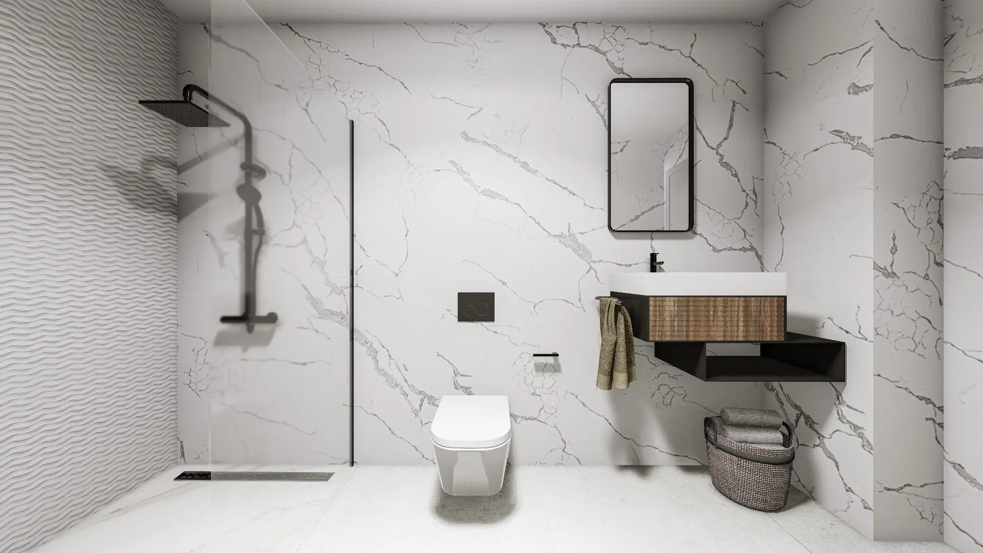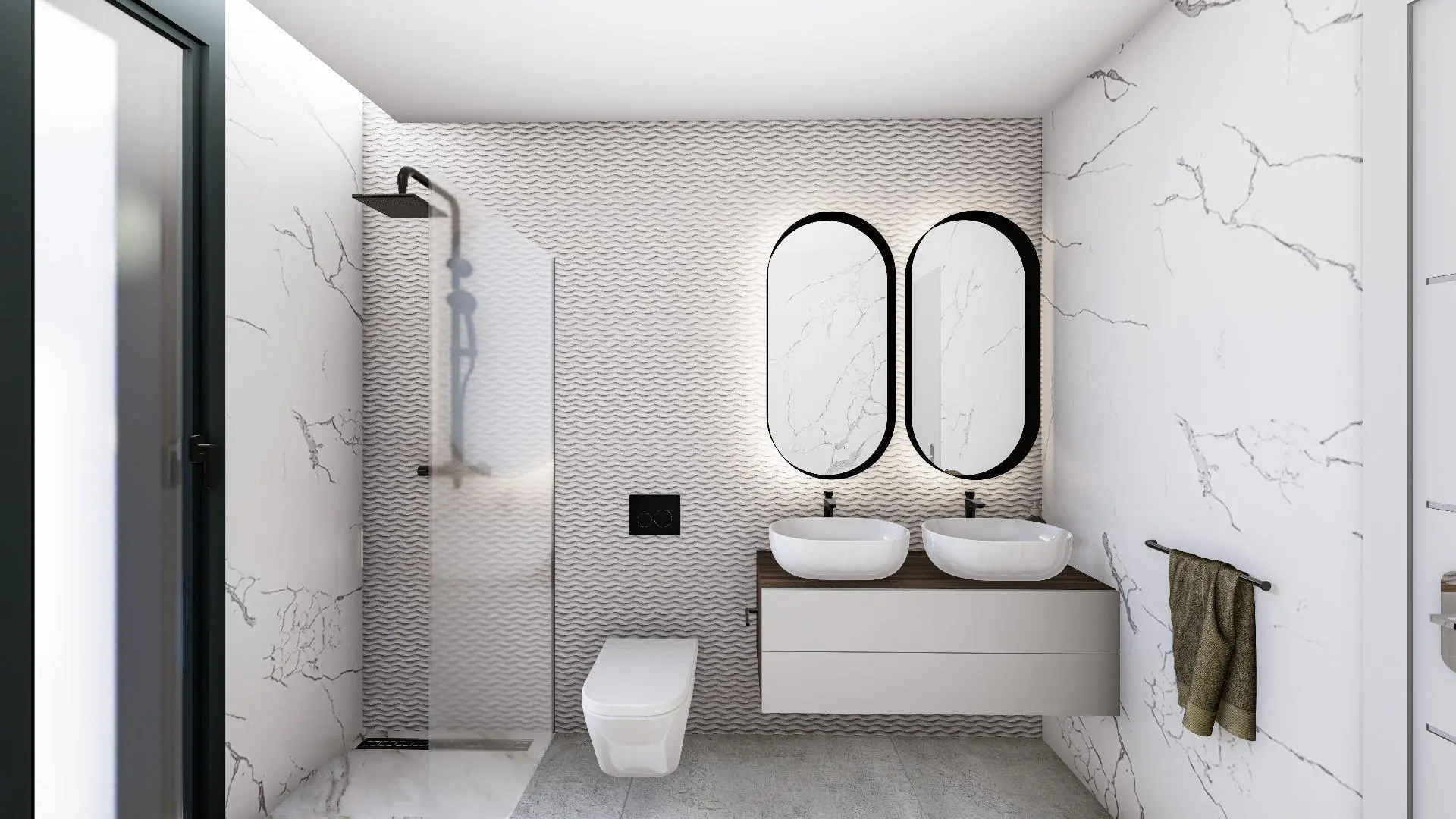 – Bathrooms with countertop sinks, single-lever taps, and safety glass screens