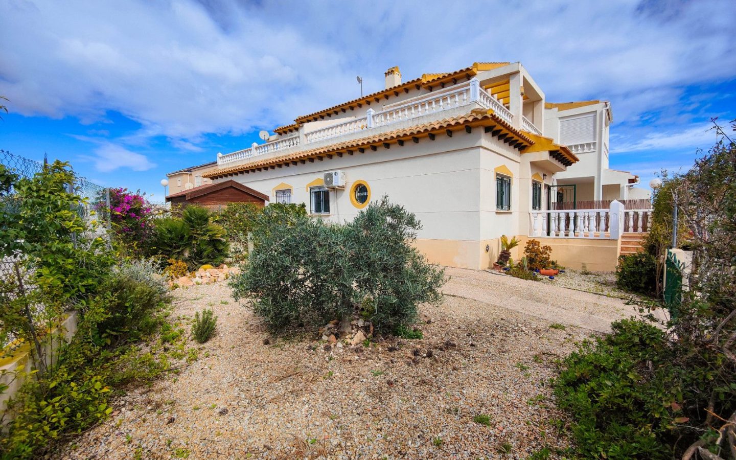 Beautiful corner quad house in Punta Prima, Orihuela Costa, located in a quiet area next to a green area and only minutes away from beaches and all amenities.The property benefits from a southwest orientation, providing plenty of natural light, and sits on a private corner plot of approximately 90 m2 with off road garden and a private garden.It offers 3 bedrooms and 2 bathrooms distributed as follows:Ground Floor:Bright living-dining roomFully equipped kitchen2 bedrooms1 full bathroomUpper Floor:Master bedroomEn-suite bathroomA major advantage is having bedrooms and a full bathroom on the ground floor, ideal for comfort and accessibility.The property is sold fully furnished and equipped, includes air conditioning in one bedroom, and is in very good overall condition.On the top level there is a spacious solarium with views over the green area and slight sea views.The residential complex features a communal swimming pool and is close to restaurants, bars, supermarkets, shopping areas, and all services.